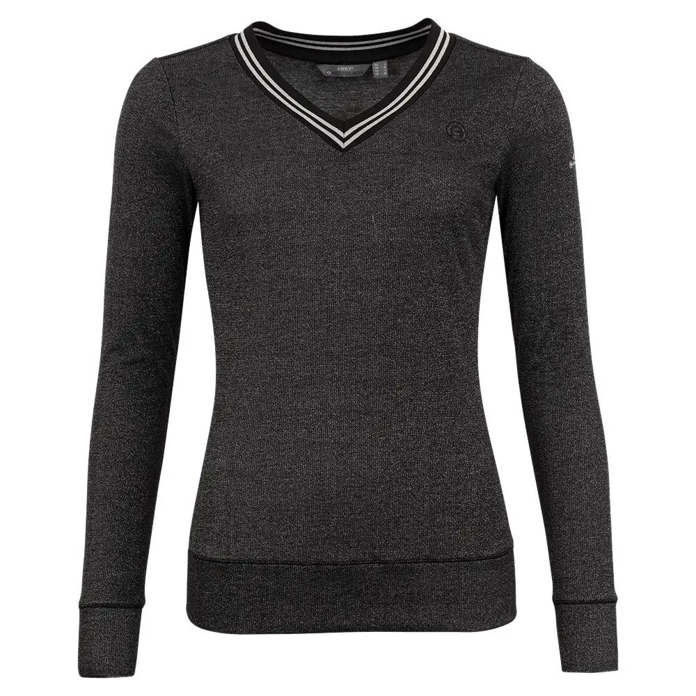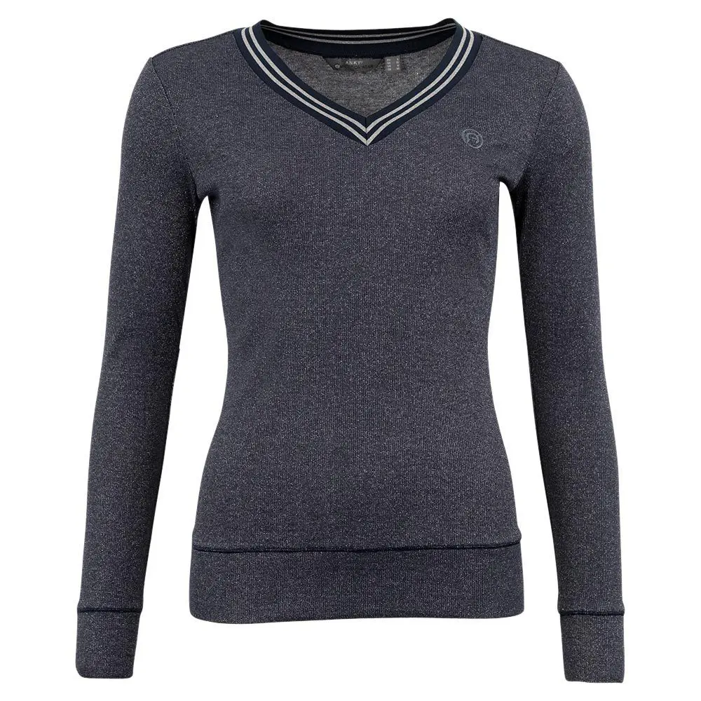 Met deze opvallende glitter pullover steel je ook tijdens trainingen en wedstrijden in kouder zomerweer of mild winterweer de show! De lichtgewicht stretchstof is ademend, waardoor je lichaamswarmte naar buiten getransporteerd wordt voor een fris gevoel. De pullover is voorzien van een elegante V-hals met zilveren streeppatroon op het ribboord. De getailleerde pasvorm en glitterprint maken de pullover tot een elegant geheel.