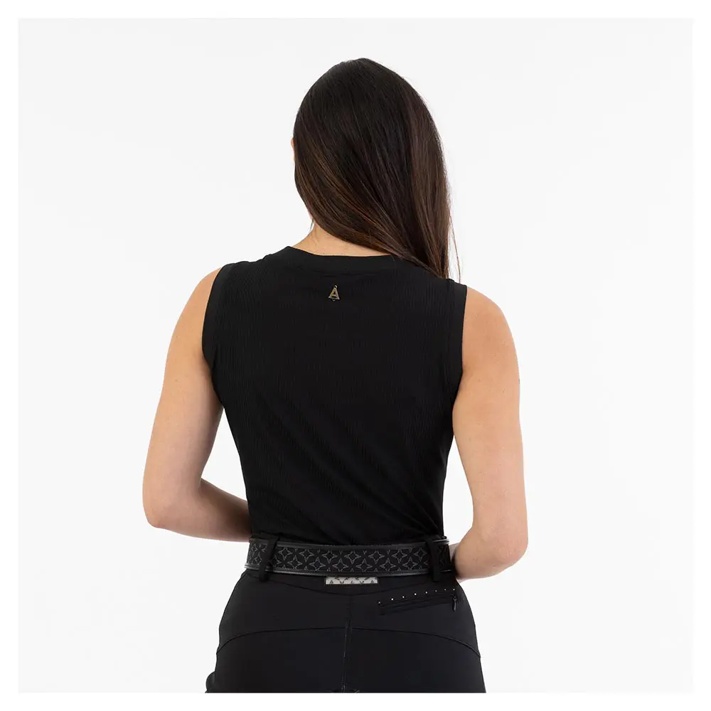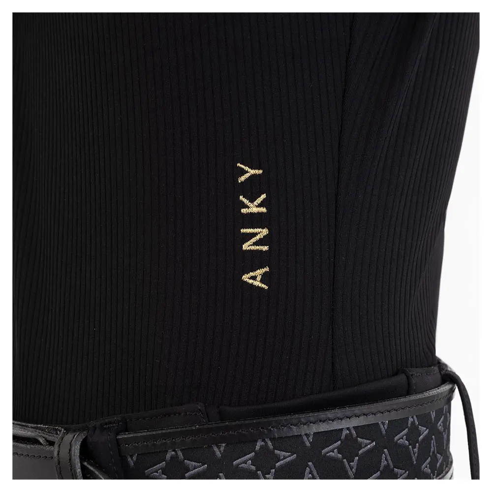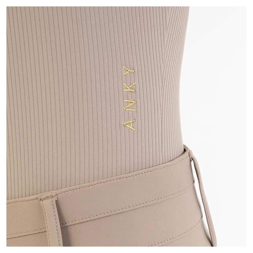 โข Geribbelde bies in dezelfde kleur langs hals en armsgat