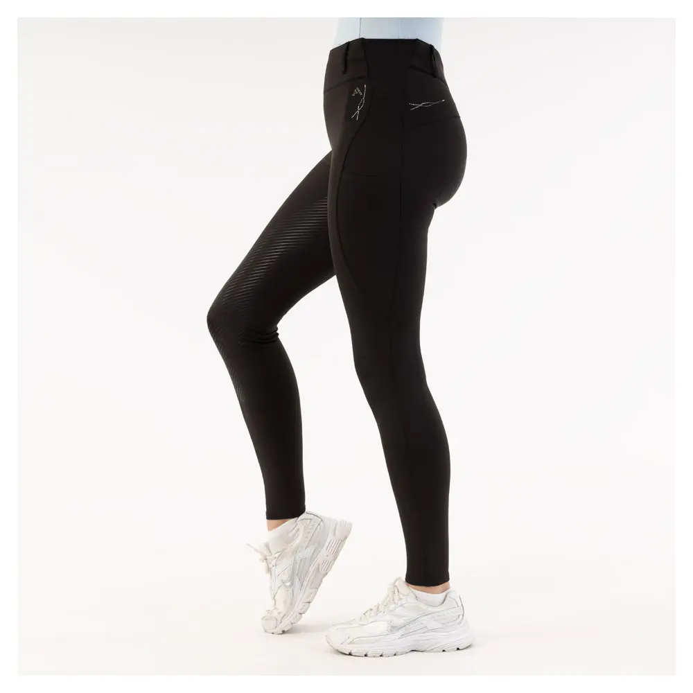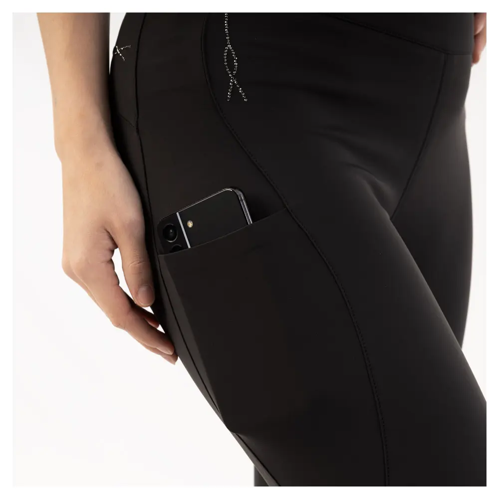 โ€ข Donker-zilveren merk-artworks aan de achterkant van de tailleband