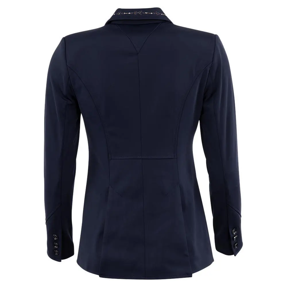 Het sierlijke borduursel in combinatie met strass steentjes in verschillende groottes en kleuren op de kraag maakt deze wedstrijdjas op chique wijze af.