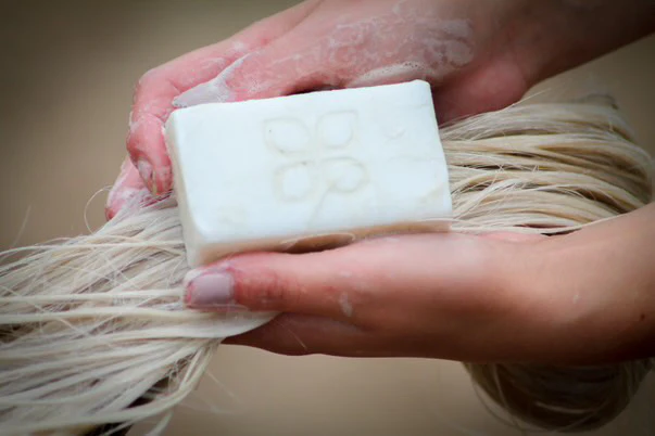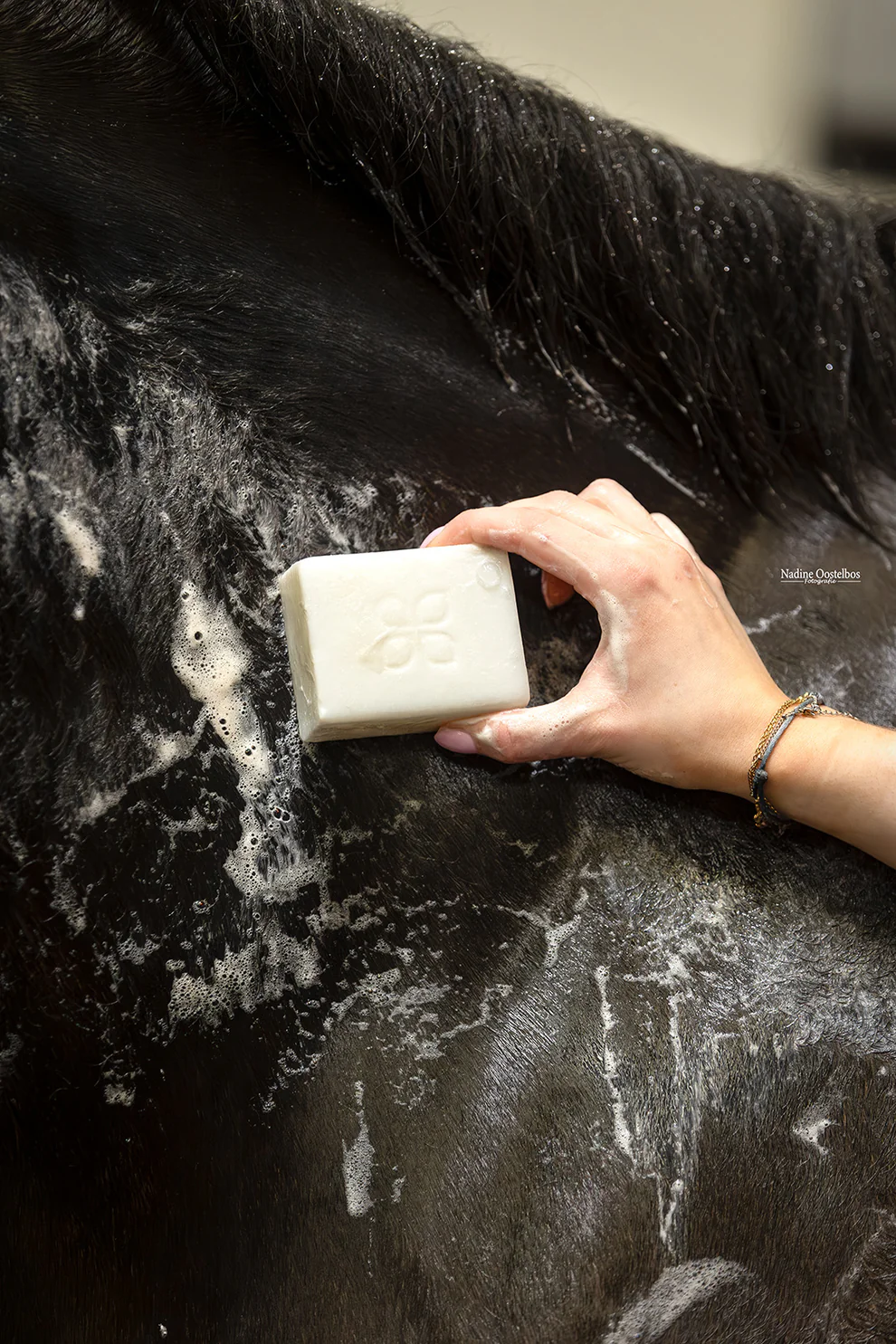 Maak de staart, manen of vacht van je paard eerst goed nat met water. Maak de soapbar nat en wrijf goed in tot er voldoende sop vrijkomt. Laat de zeep 5-10 min inwerken en spoel uit. Indien je paard nog niet volledig schoon is herhaal het proces.