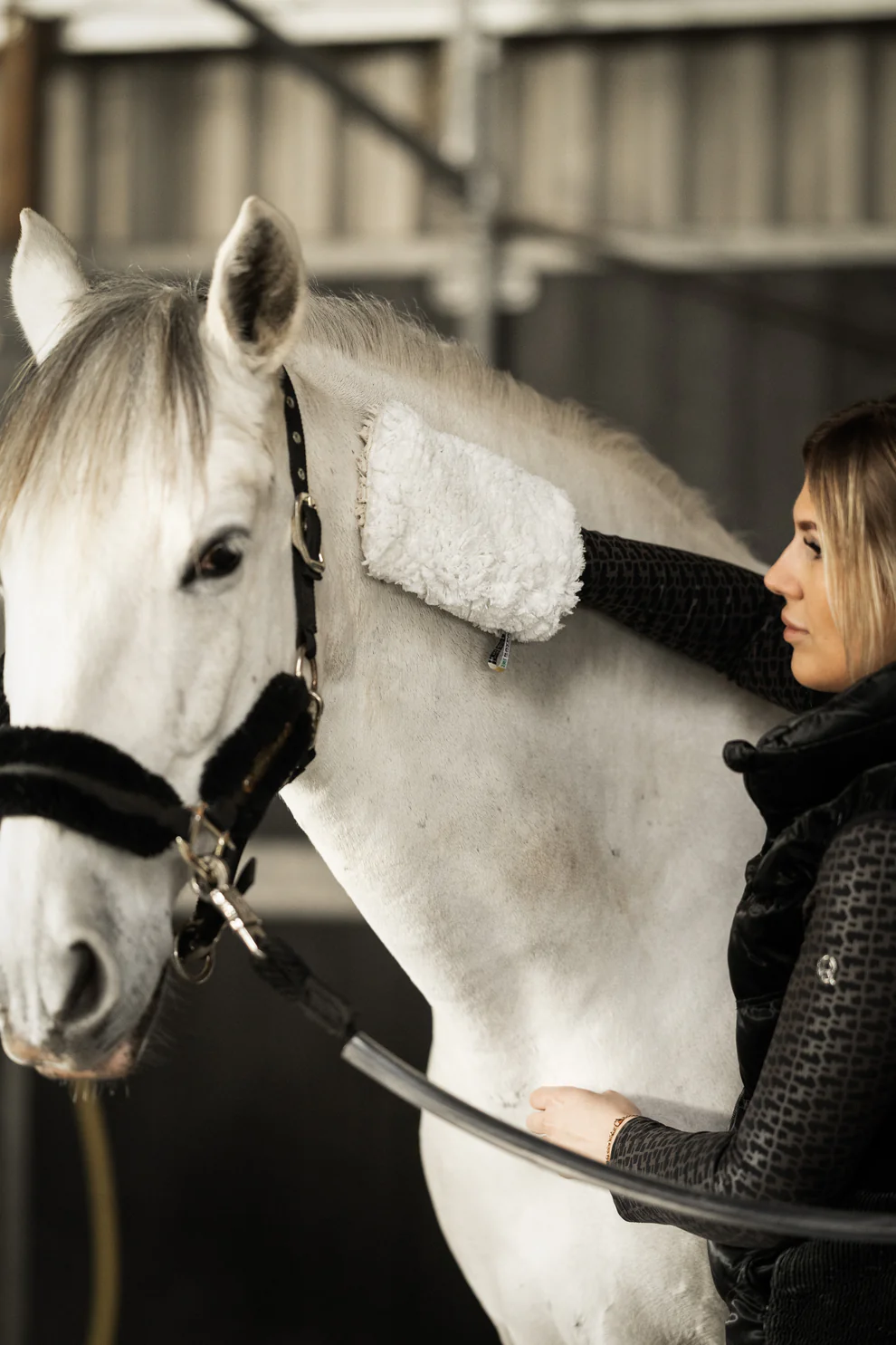 De witte poetshandschoen is jouw ideale hulpmiddel voor een opfrisbeurt zonder je paard te hoeven wassen. Met alleen water verwijdert deze handschoen effectief (mest)vlekken en vuil. Door geรฏntegreerde nano zilver technologie in de vezels van de handschoen werkt de handschoen anti-bacterieel. Daarnaast is de handschoen heerlijk zacht.