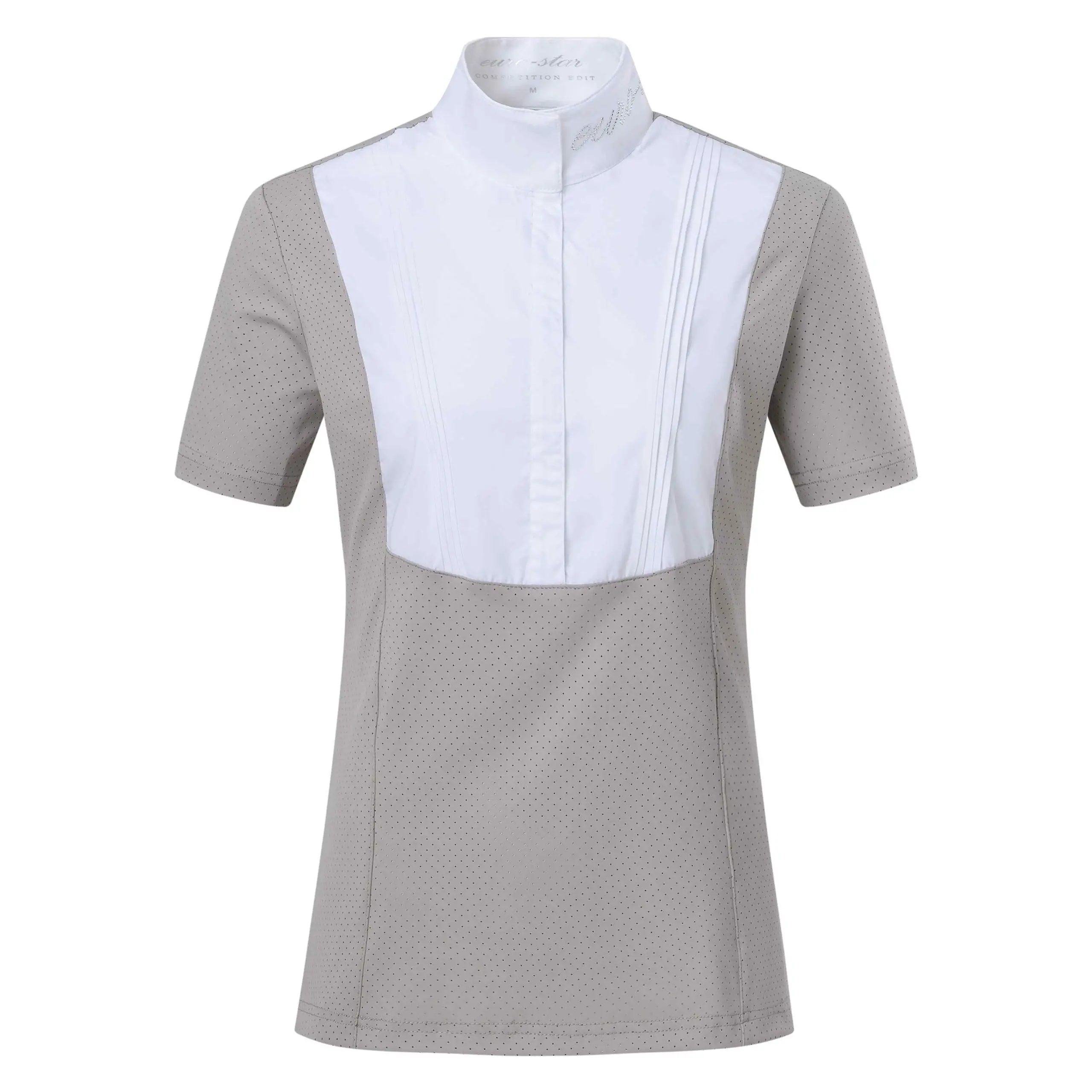 Hoogwaardig wedstrijdshirt met gevormde geplooide katoenen inzet aan de voorzijde * Geperforeerde jersey voor ventilatie * Opstaande kraag (6 cm hoog) met verfijnd strass-kunstwerk * Netjes afgewerkt met getapete naden * Blinde sluiting met drukknopen