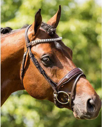 Dit hoofdstel is uitgevoerd in special soft leder, met ss fournituren met blinde sluitingen aan bakstukken en teugels . Het kopstuk is zacht gevoerd en terug gesneden.Met anatomische lak neusriem 4cm breed en Flower stone frontriem