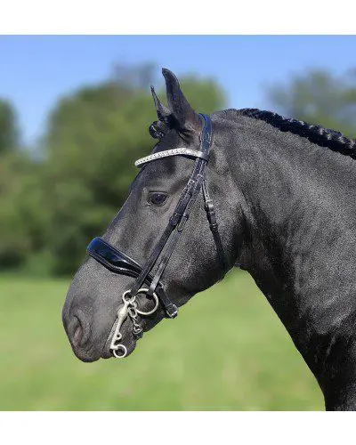 Dit stang en trens hoofdstel is uitgevoerd in special soft leder, met ss fournituren met blinde sluitingen aan bakstukken en teugels . Het kopstuk is zacht gevoerd en terug gesneden.Met anatomische lak neusriem 4cm breed en white glitter stone frontriem