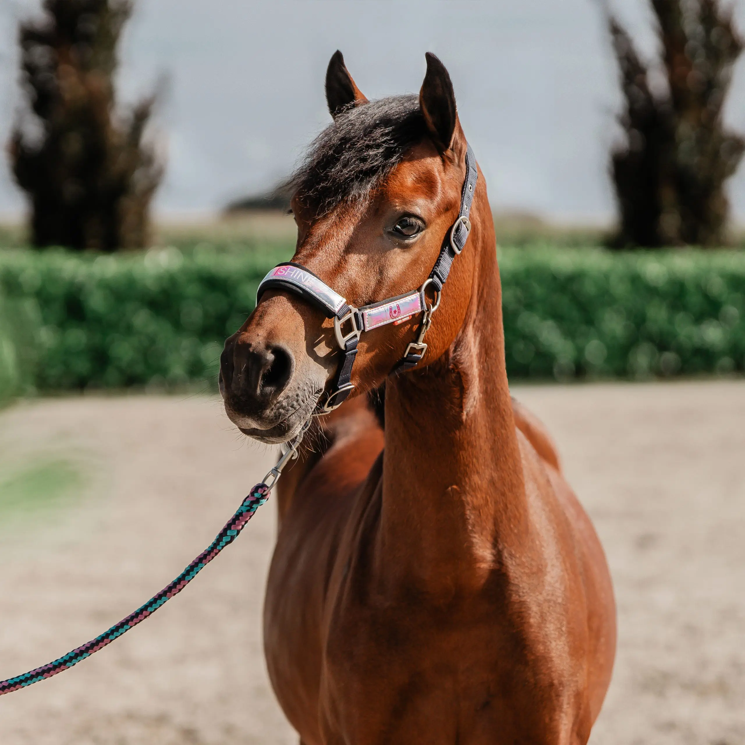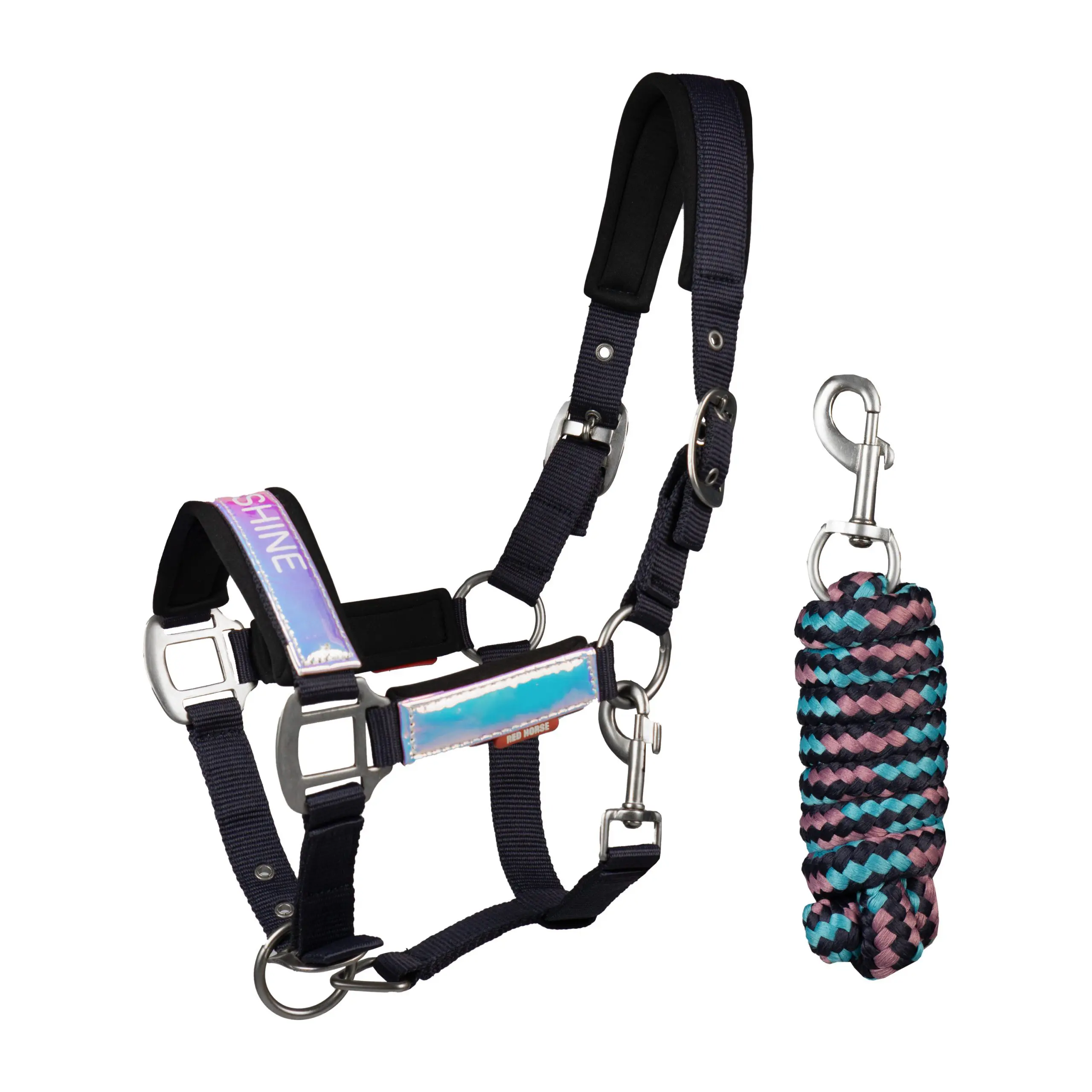Nylon halster met holografische glimmende accenten, inclusief bijpassend 200 cm halstertouw.