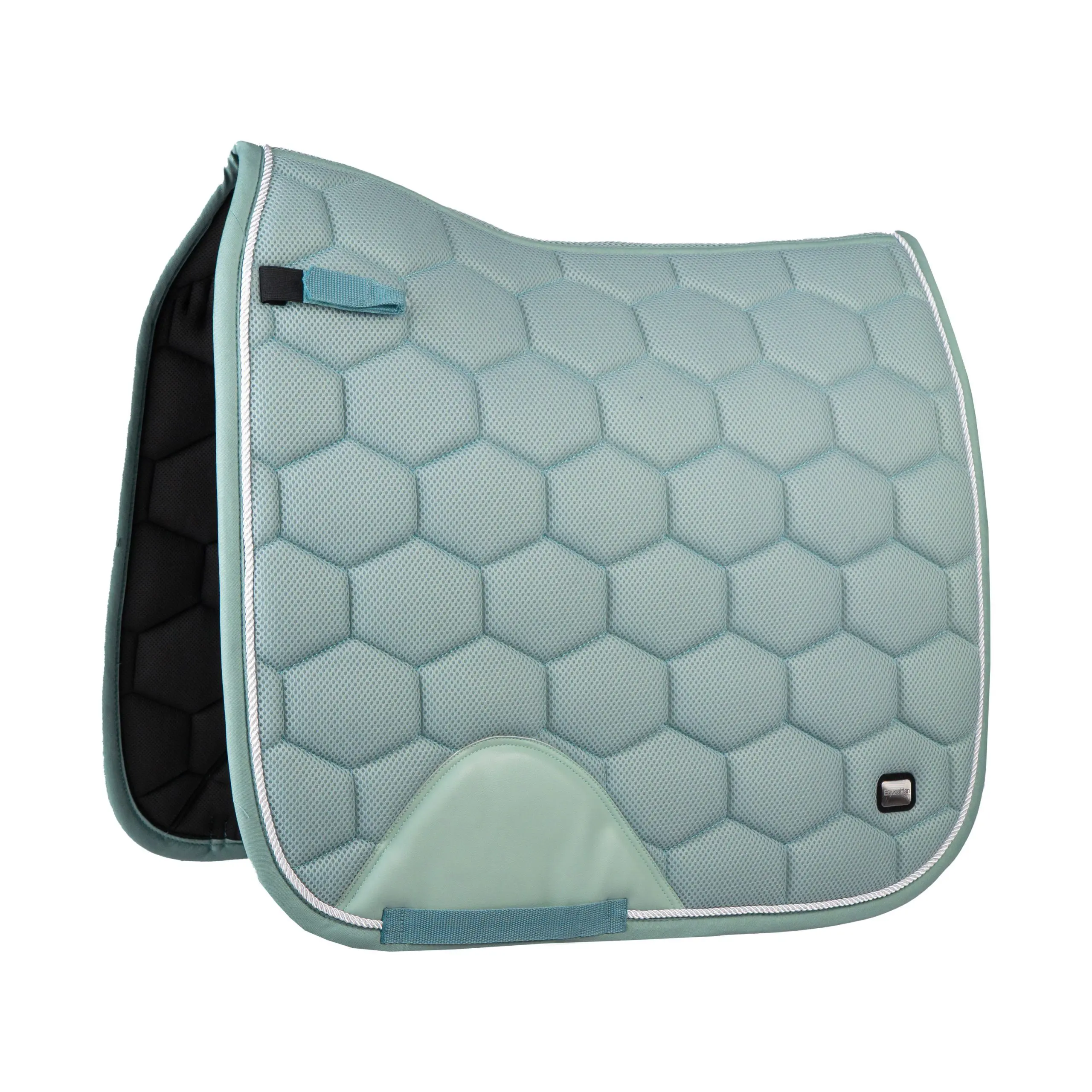 Elegant en ademend mesh dressuur zadeldek met witte parelmoer accenten en hoge schoft voor een fijne pasvorm. De PU versteviging bij de singel en de elastische D-ring bevestiging zorgen voor een functioneel ontwerp.