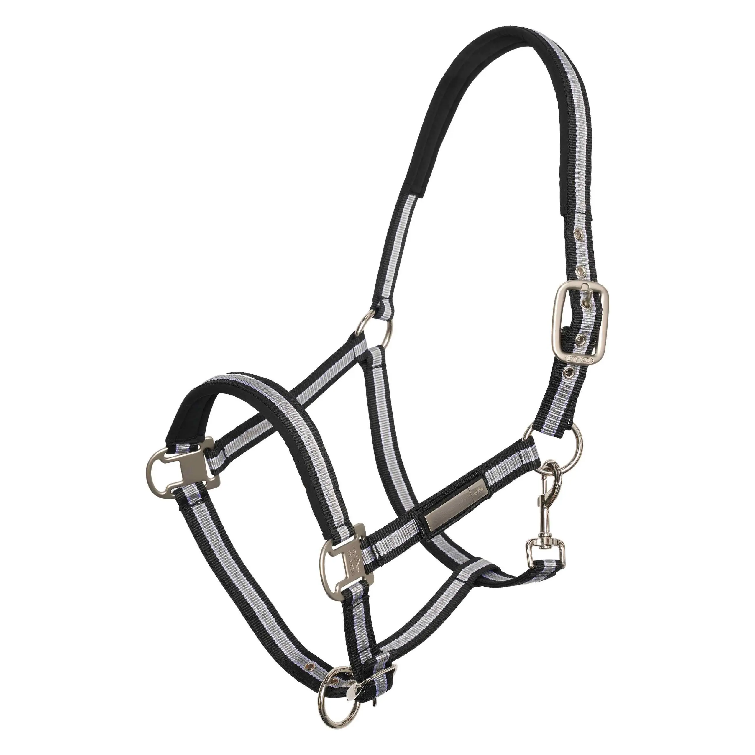 Sportief halster met zachte vulling bij hoofdband en neusriem * In maat verstelbaar bij de hoofdband * Verstelbare neusriem * Verstelbare patch op wangriem met metalen logoplaatje waar de naam van je paard in gegraveerd kan worden
