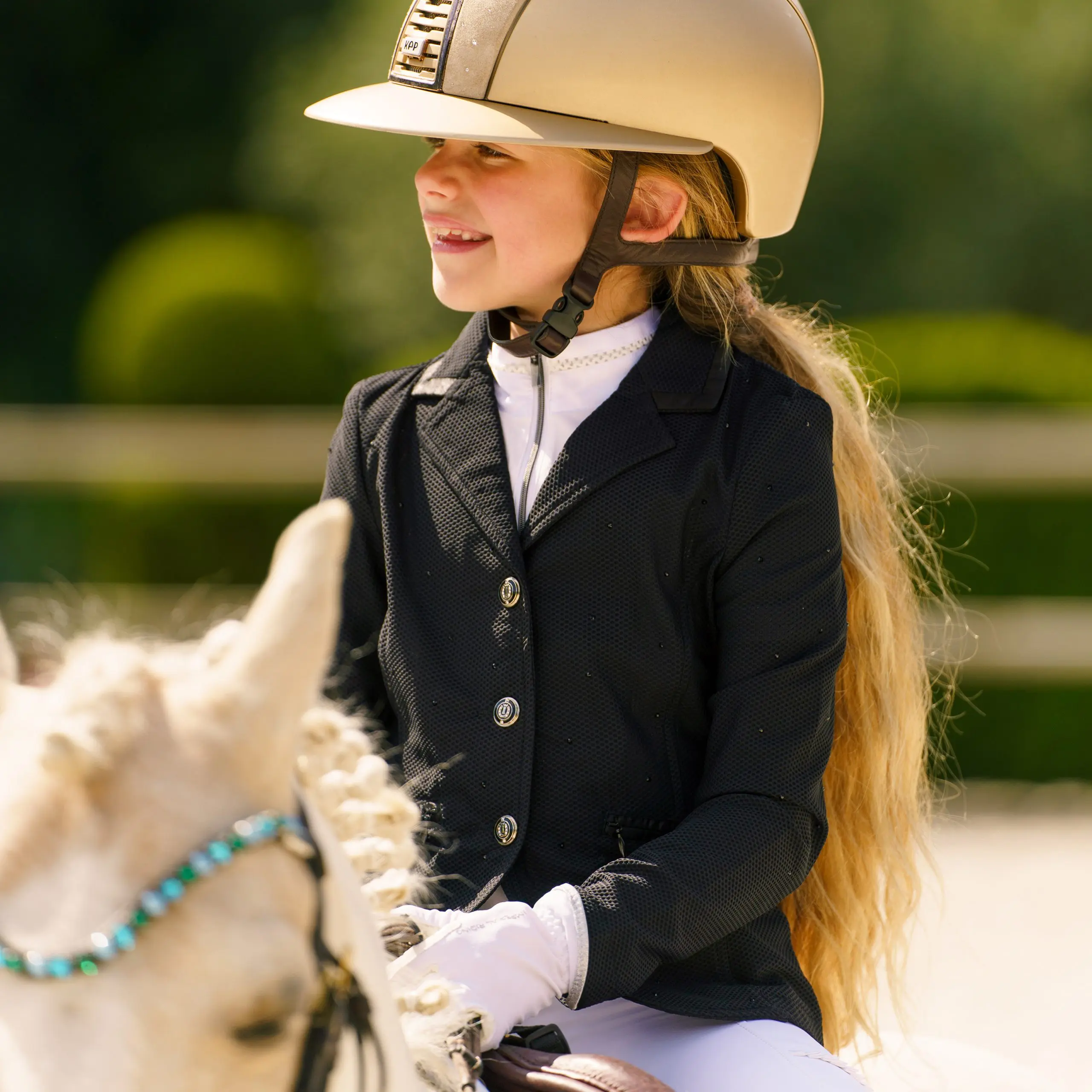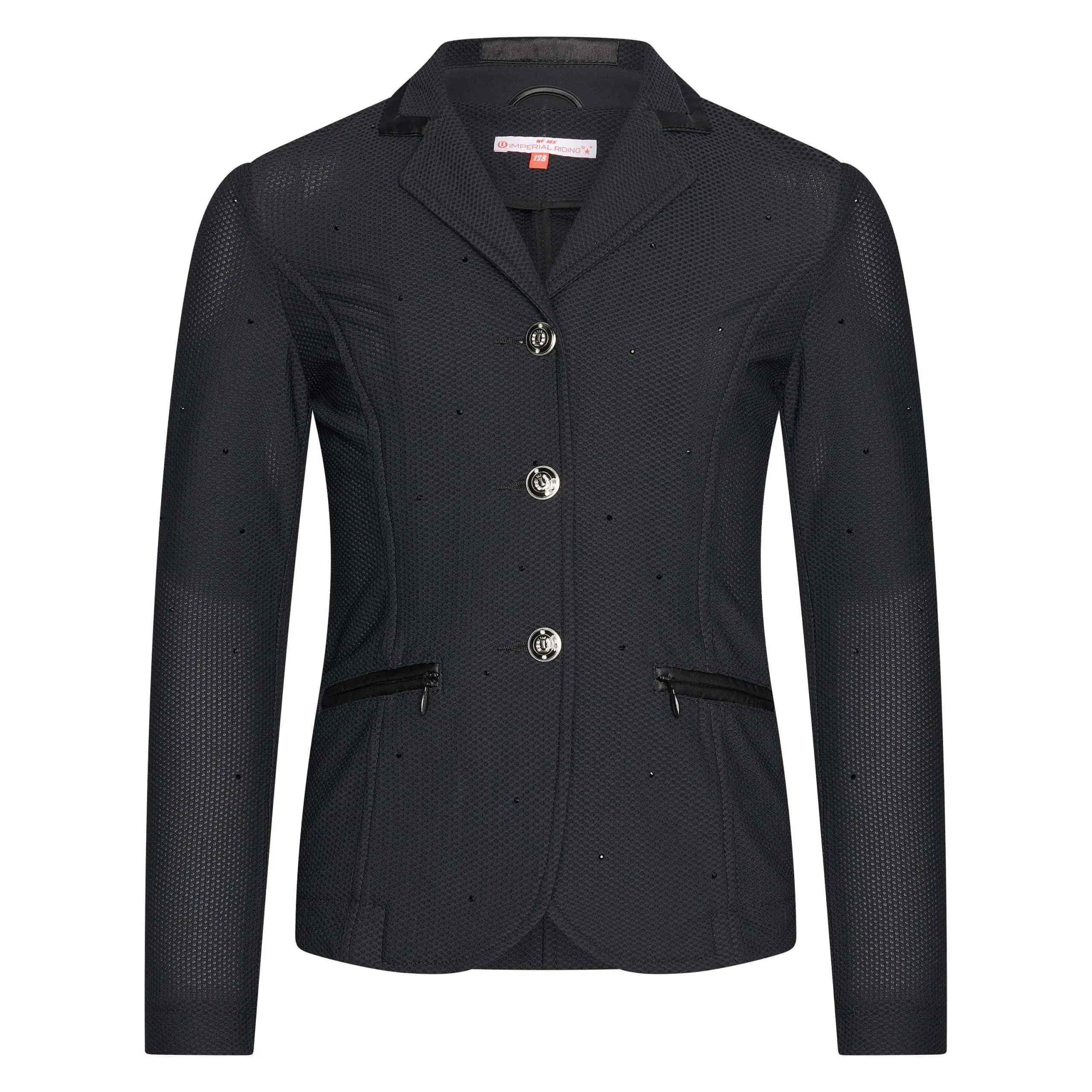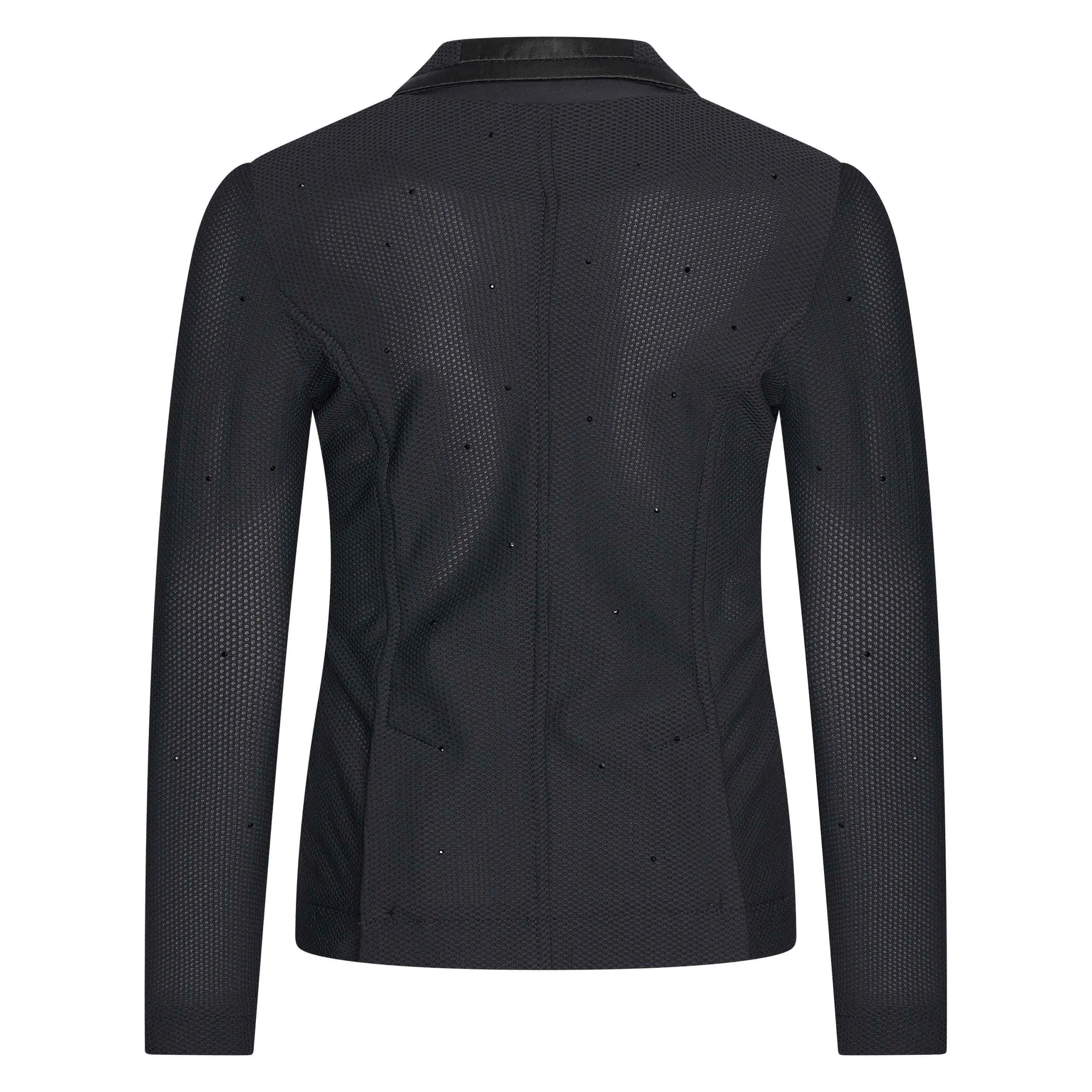 4 Way stretch stof * Wedstrijdblazer met verdekte rits CF en 3 zichtbare knopen * 2 Dubbele paspelzakken met beklede rits * Voor- en achterkant mesh stof met kleine strass * Mouw, kraag en revers mesh stof * 2 Split in rugdeel * Ongevoerd * Randkraag satijn stof * Knoop met kristalsteentjes * Ultralichte stof * Ademende stof
