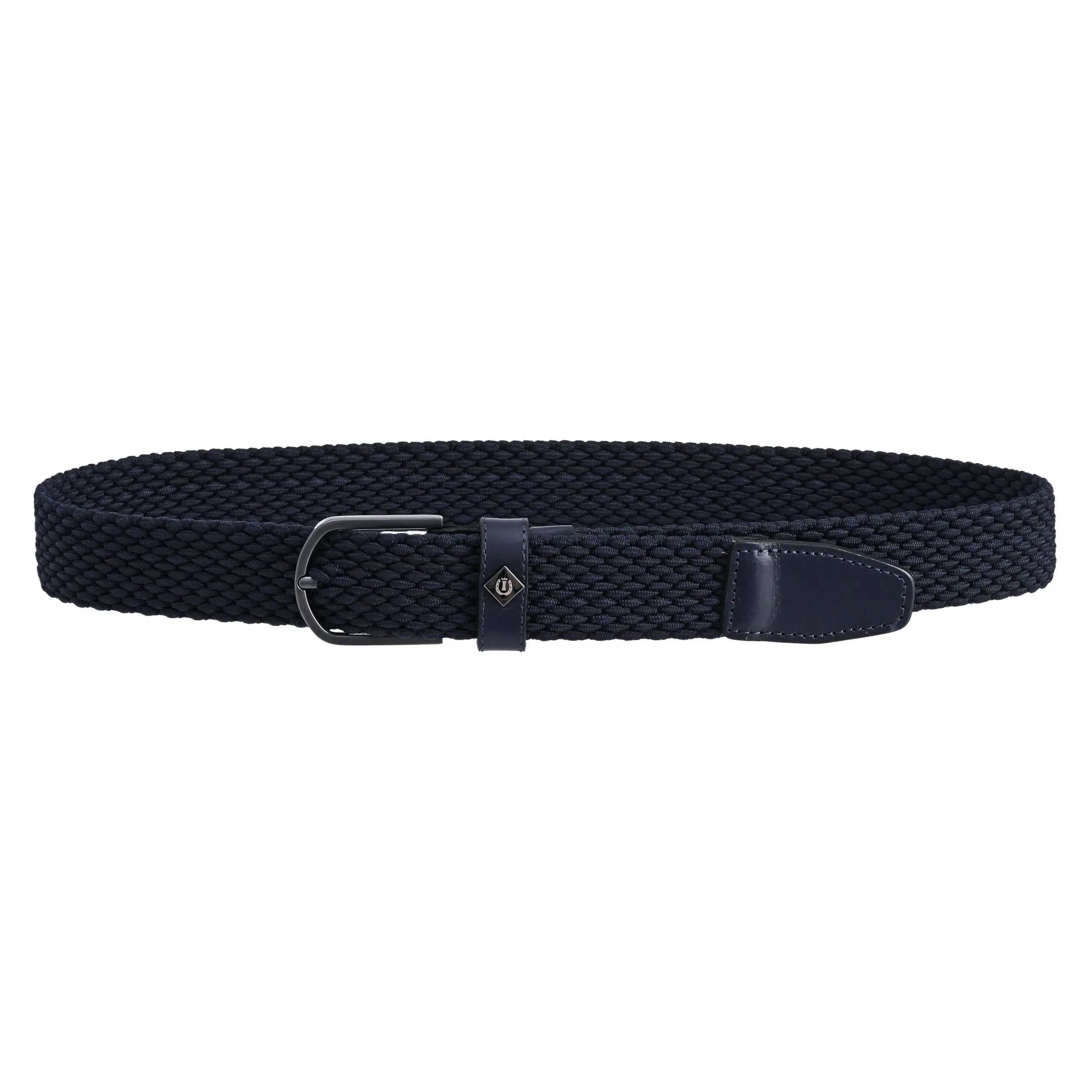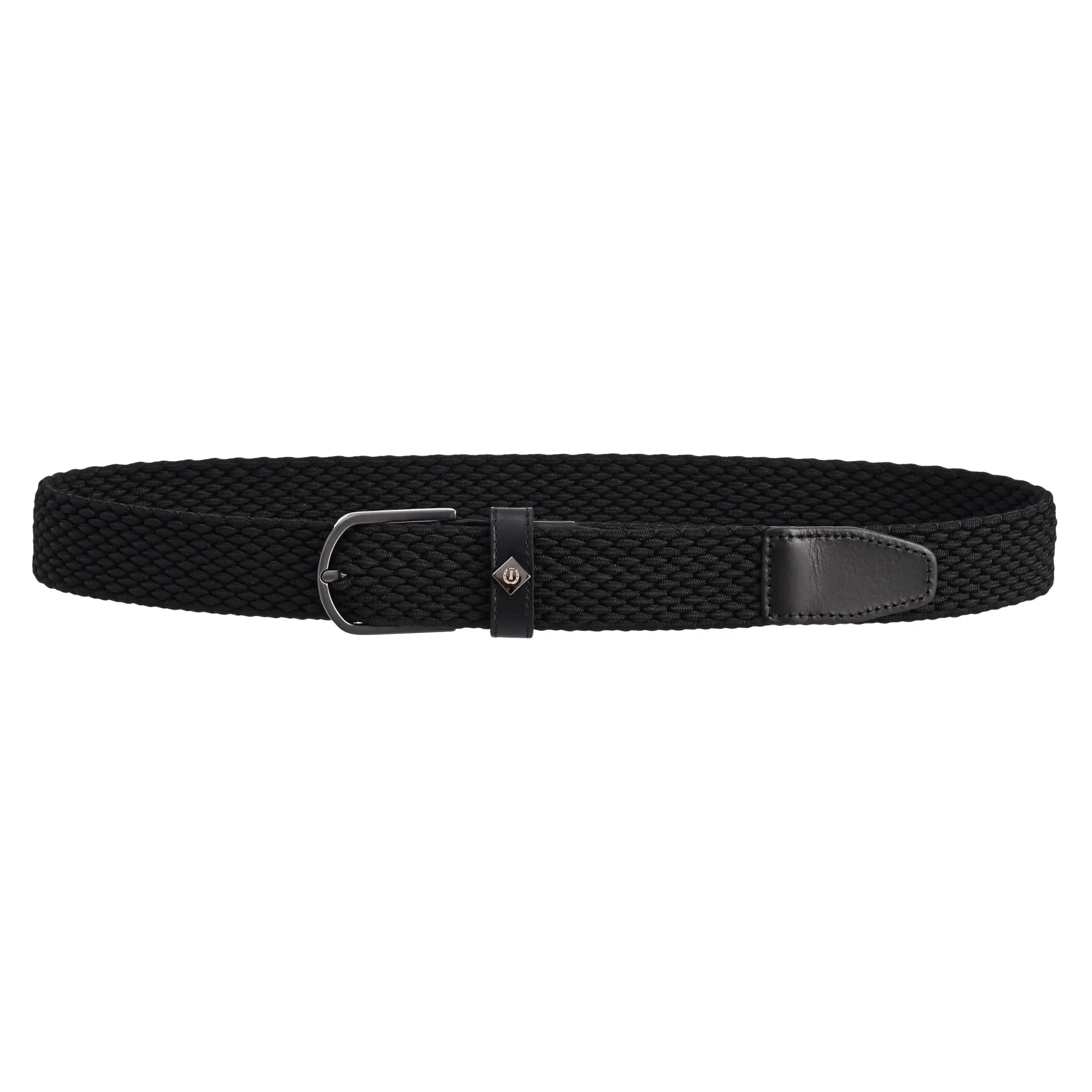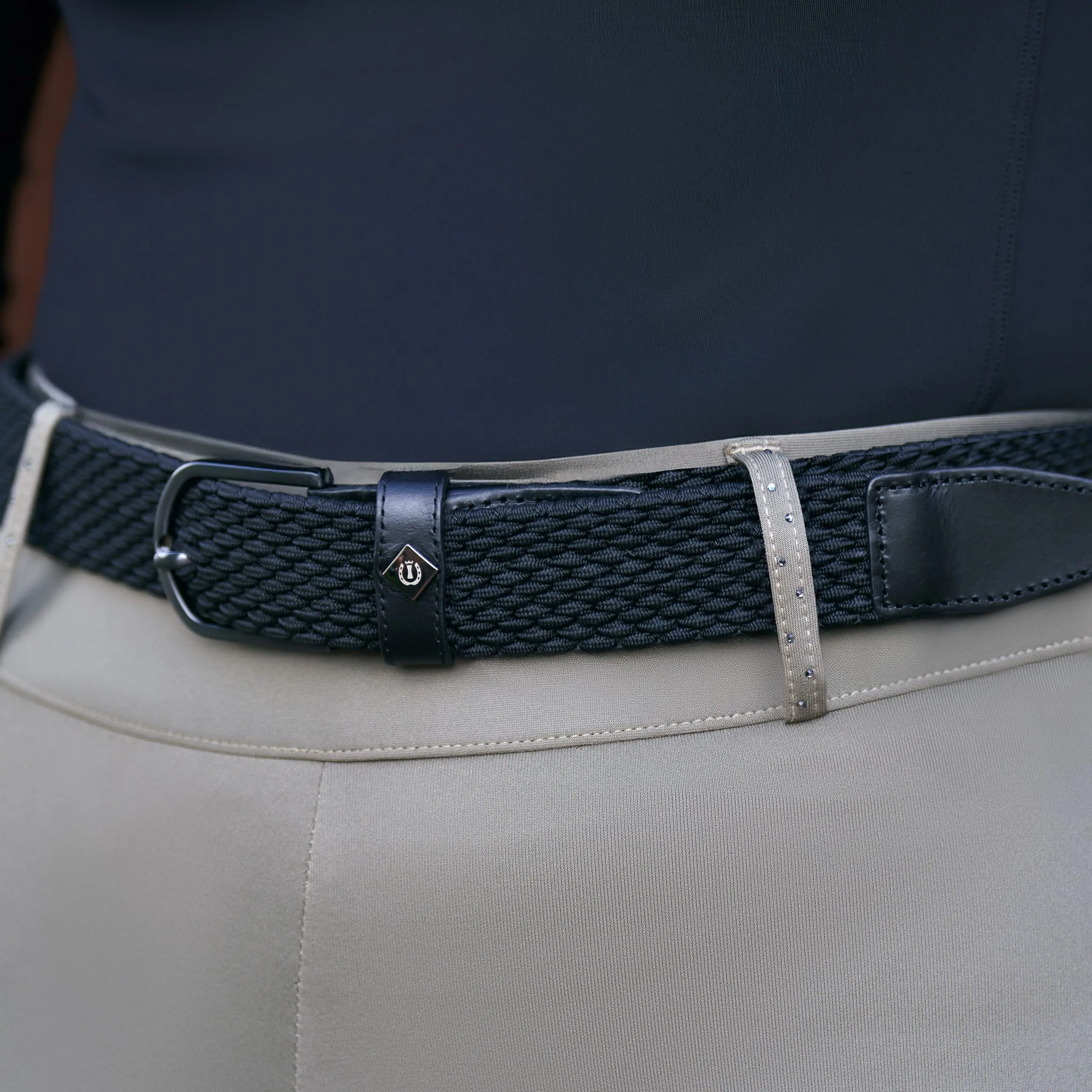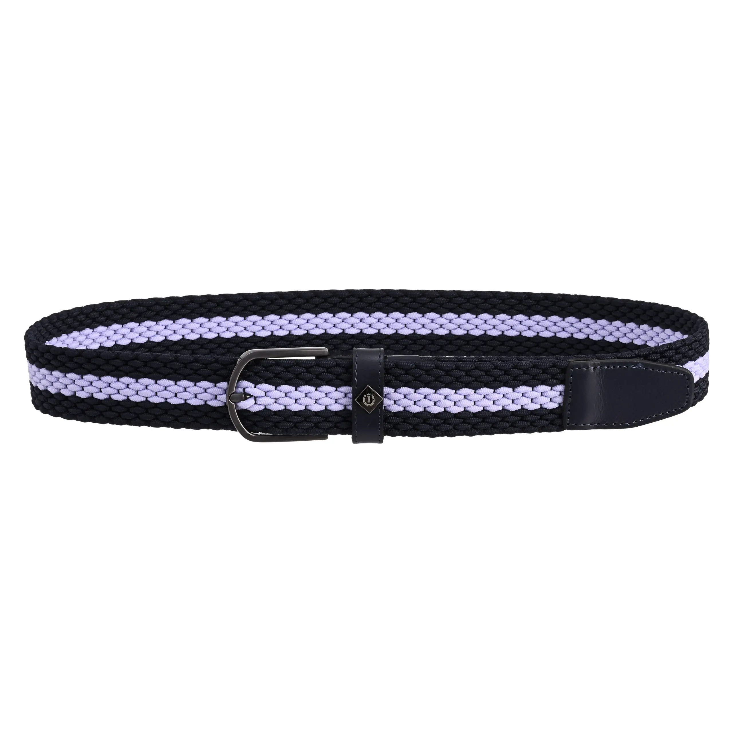 Glanzende Imperial Riding riem met elastisch comfort, opvallend horizontaal vlechtpatroon en metalen logo op de riemlus