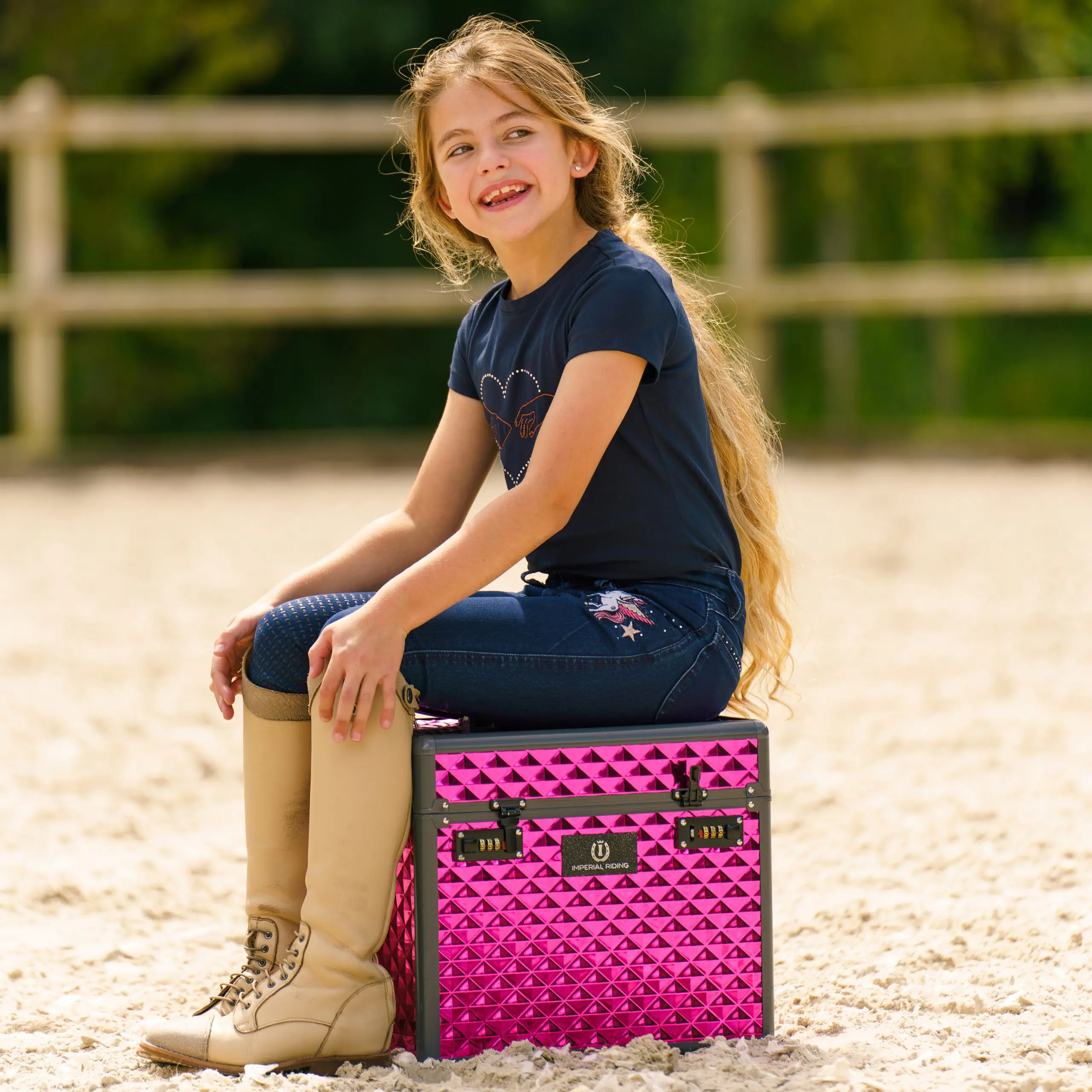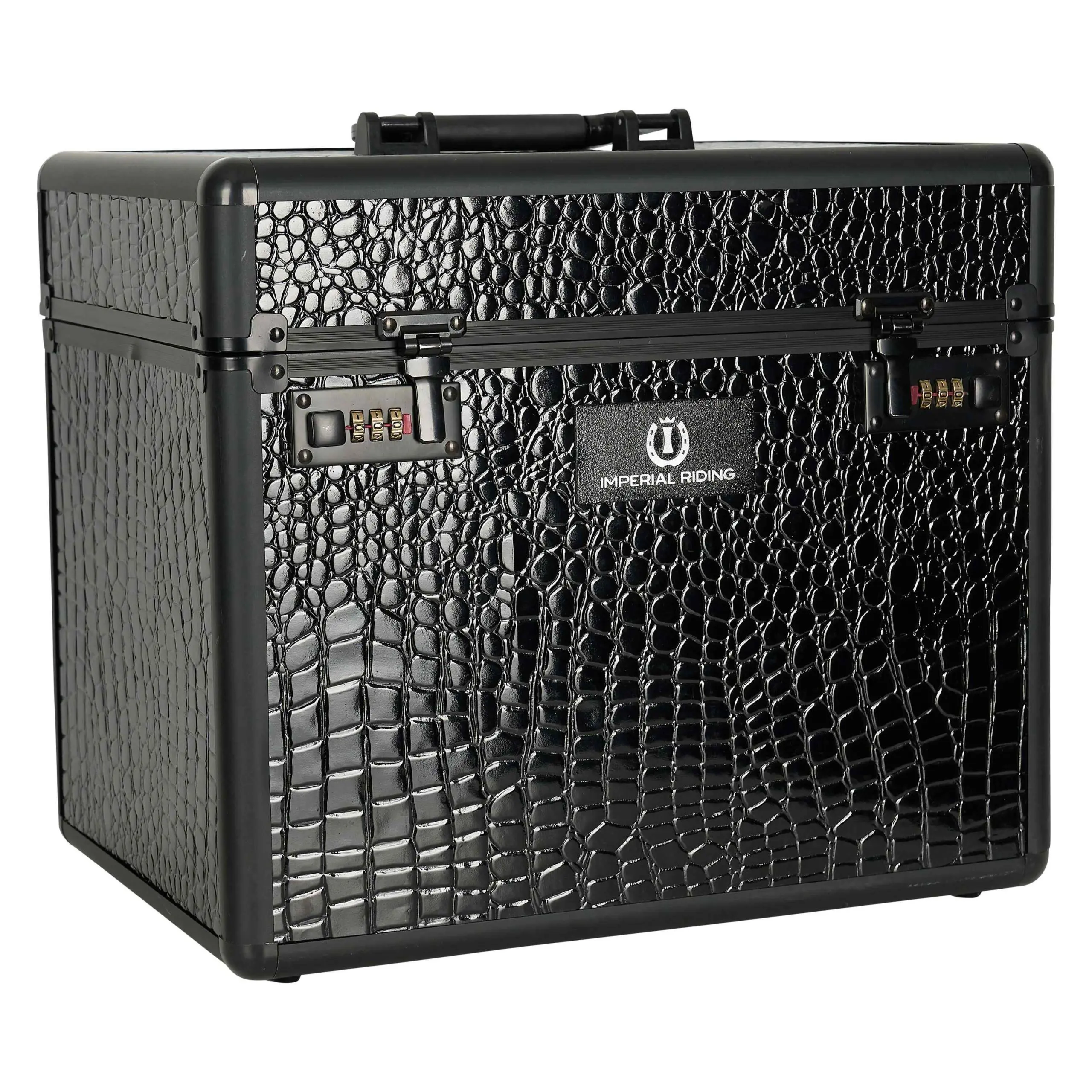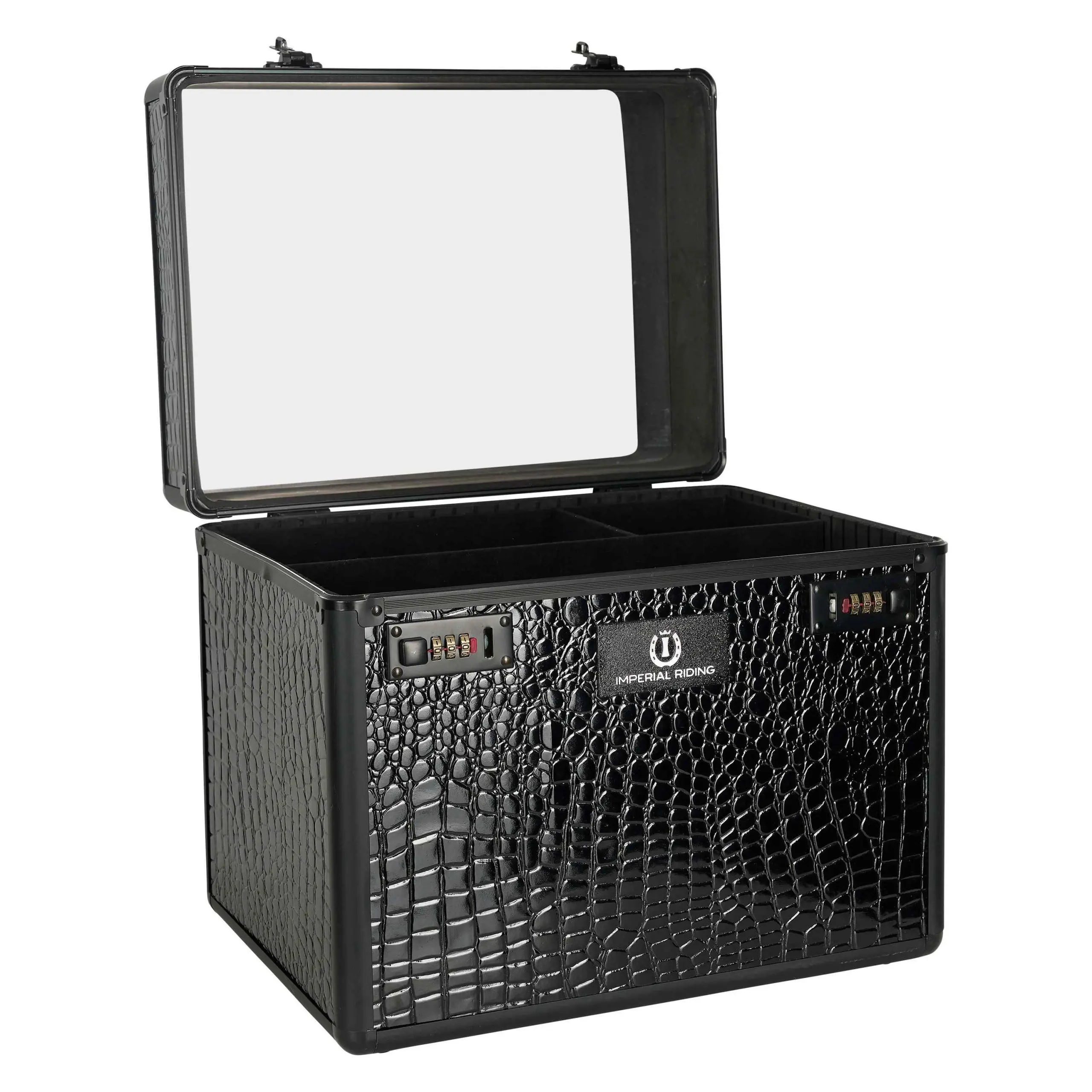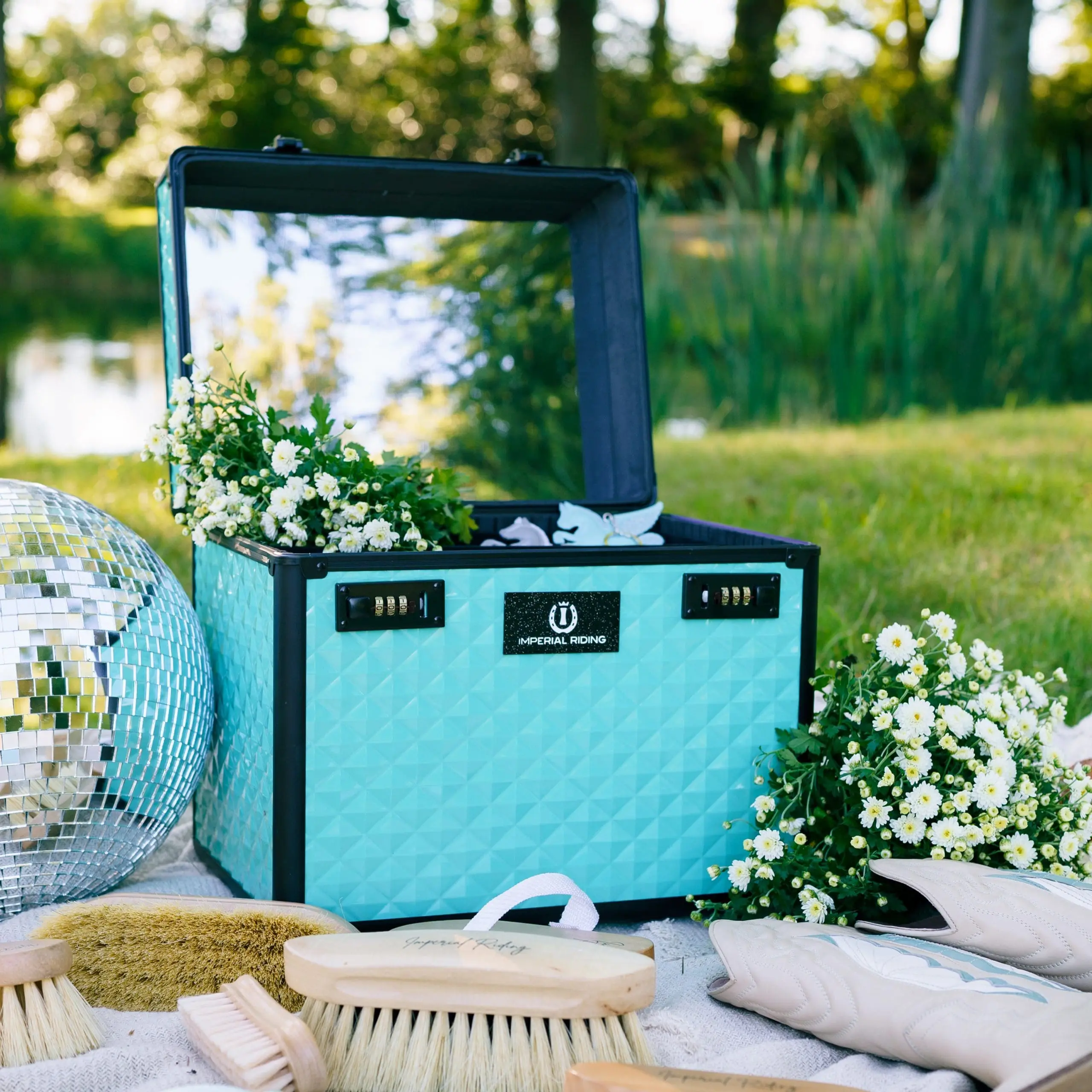 Alleen het beste voor je paard en zijn verzorging – onze bestseller Grooming Box Shiny is de perfecte poetsbox om al je verzorgingsspullen en accessoires in op te bergen. De inlay van deze box is gemaakt van een zacht materiaal om je waardevolle spullen te beschermen en de space dividers kunnen worden aangepast om je spullen mooi te organiseren. Een kleinere inlay bevat vakken voor bijvoorbeeld lekkernijen en haarelastiekjes en met de spiegel in de deksel kun je snel nog even je stijl controleren voordat je vertrekt voor je rit. Om het allemaal veilig te houden kan de Shiny Grooming Box worden afgesloten met twee cijfersloten. Deze sterke, duurzame en gemakkelijk te reinigen poetsbox zal er altijd zijn om je te helpen tijdens je dagelijkse training, competitie en al je andere avonturen in de stallen. Afmetingen (LxBxH): 38x28x32 cm.