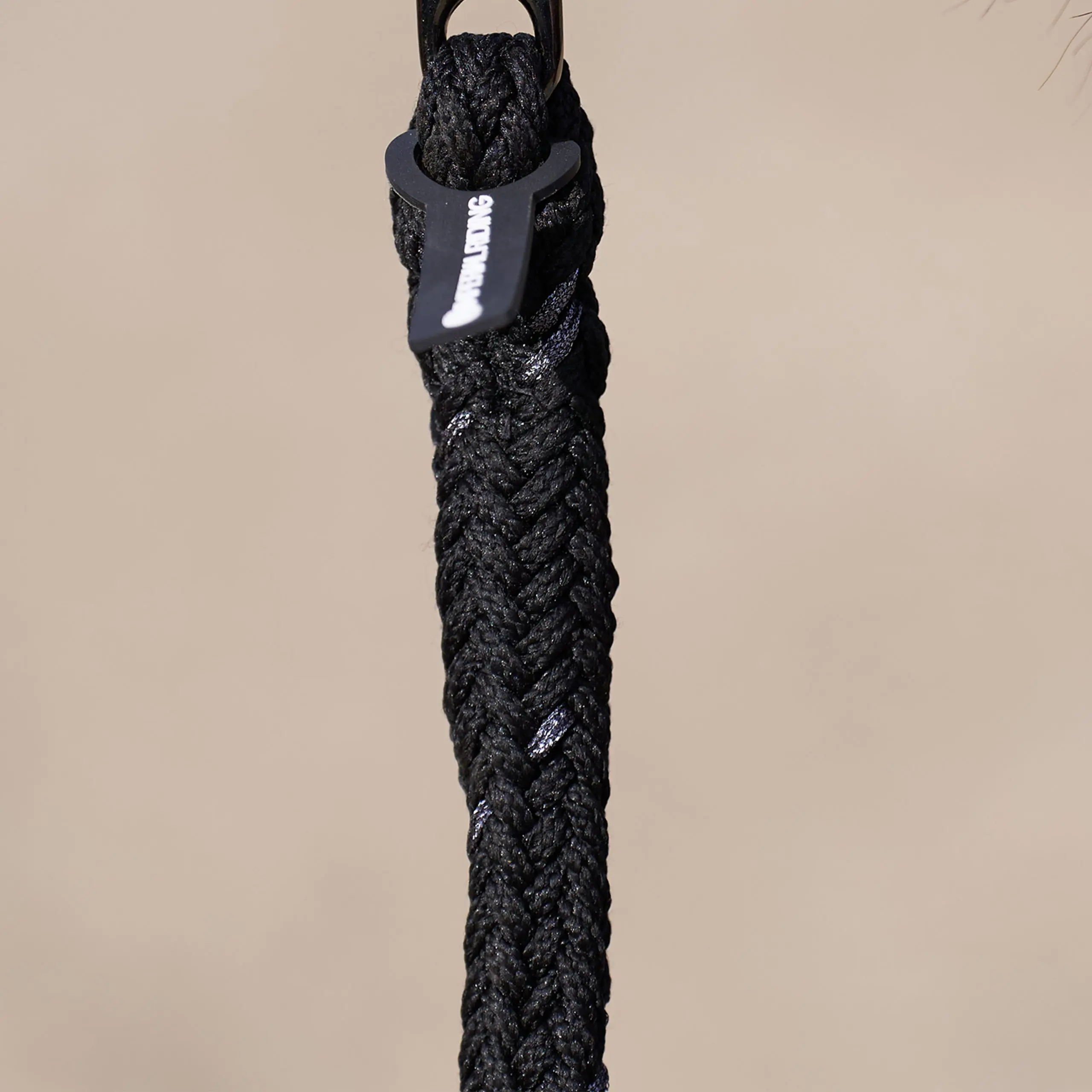 Deze halstertouw is geweven met lurex voor een vleugje glitter en is verkrijgbaar met een karabijnhaak of paniekhaak. Duurzaam en stijlvol, biedt het betrouwbare controle en een veilige verbinding voor je paard.