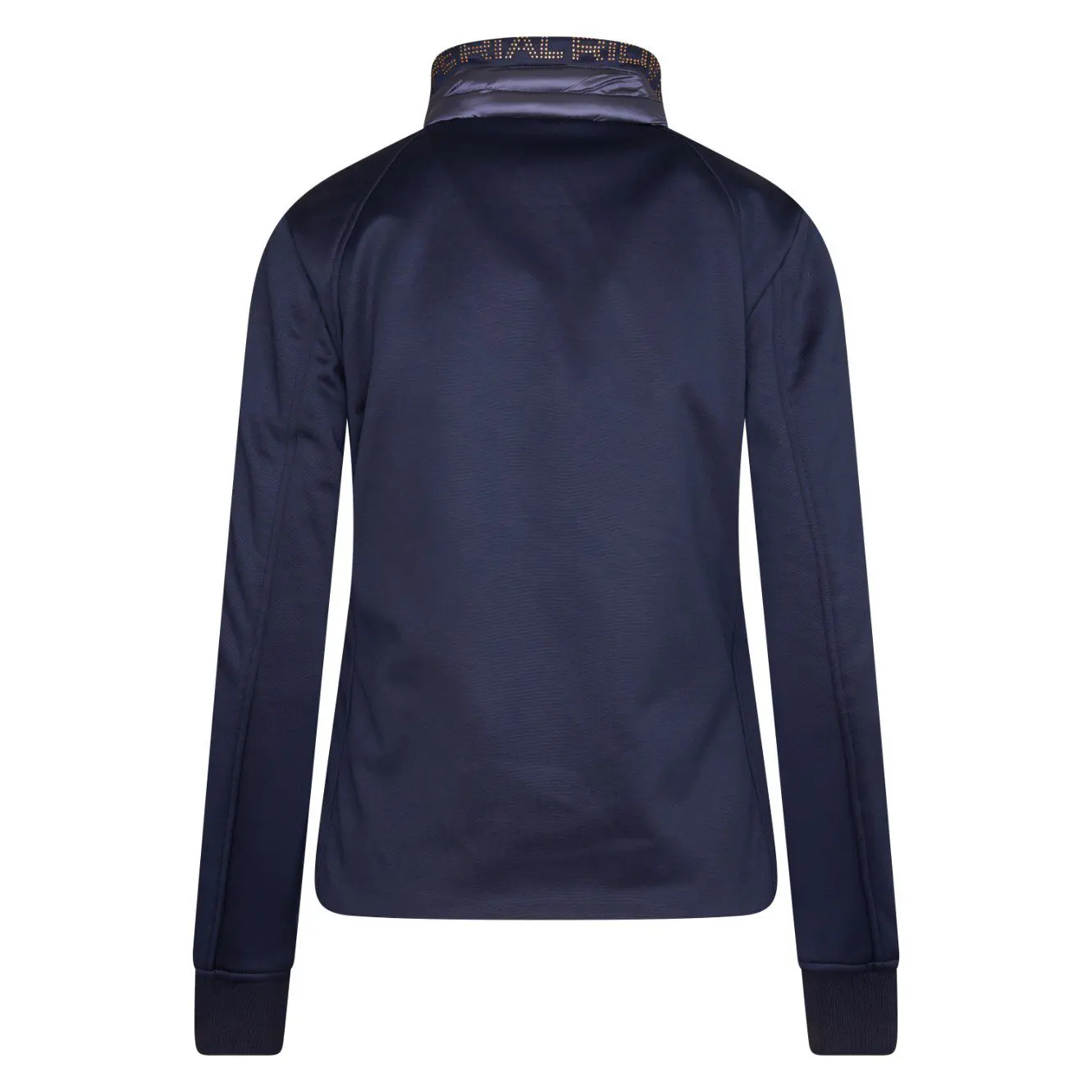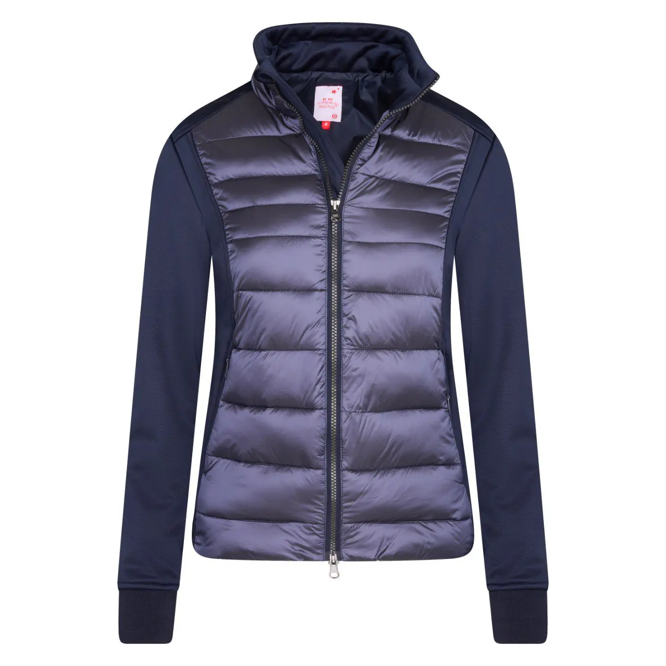 Een jack voor alle seizoen met een voorkant van kunstdons en een recht quiltpatroon. De mouwen en de rug zijn gemaakt van technische shellstof. Manchetten en zoom van 1×1-ribbreiwerk, tweewegrits aan de voorkant en zakken met ritssluiting. Let ook op het prachtige artwork achterop de kraag, met steentjes die samen de woorden Imperial Riding vormen.