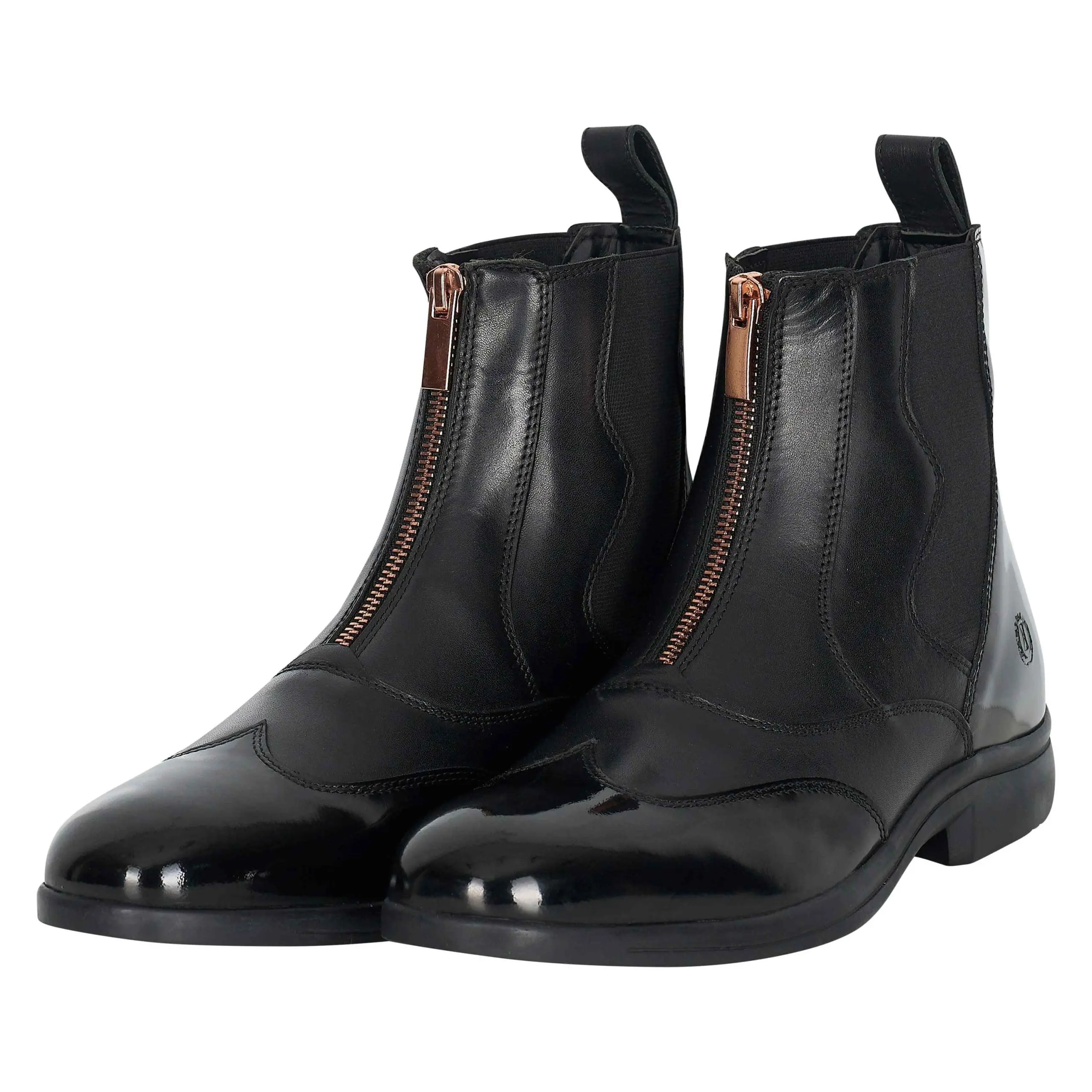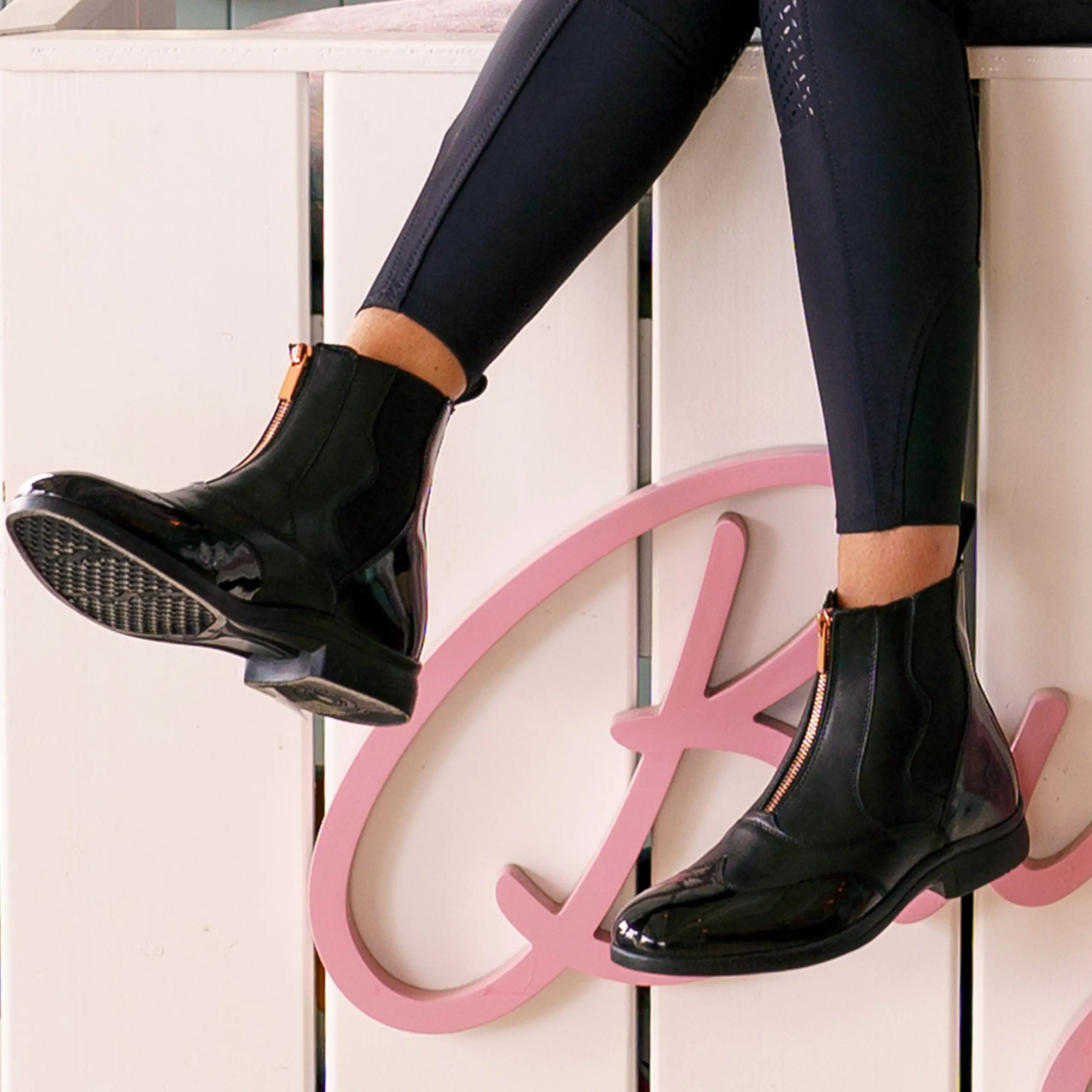 Schitter in deze modieuze IR rijlaarzen. De korte laars heeft een mooie rosรฉgouden ritssluiting aan de voorkant voor eenvoudig dragen. De rijlaars is verkrijgbaar in zwart, bordeaux en zwart lak variant.