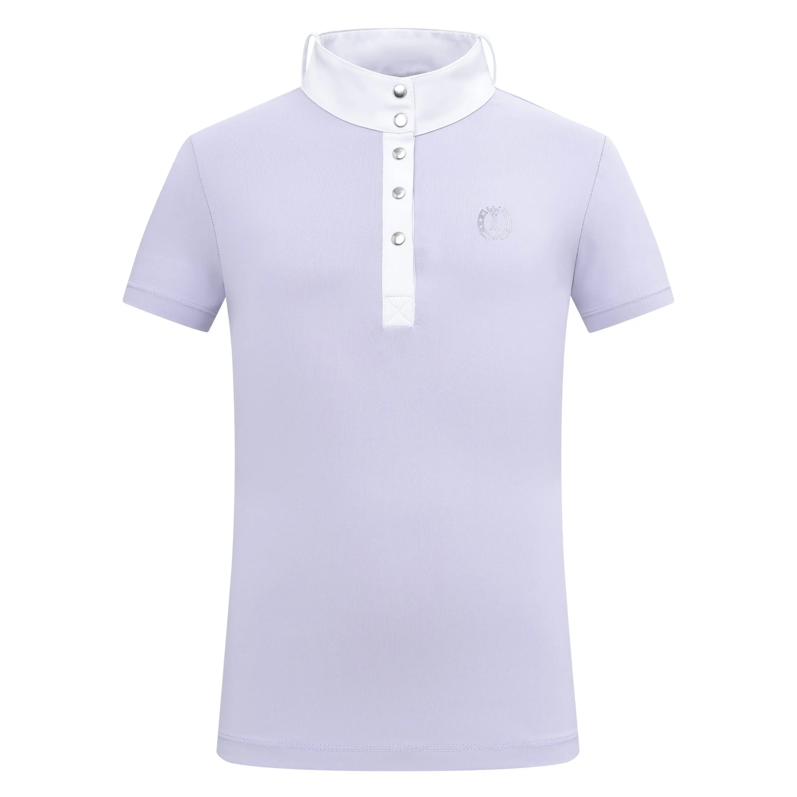Dazzling children’s short-sleeve competition top with crystal rhinestone logo, snap placket, and plastron loops