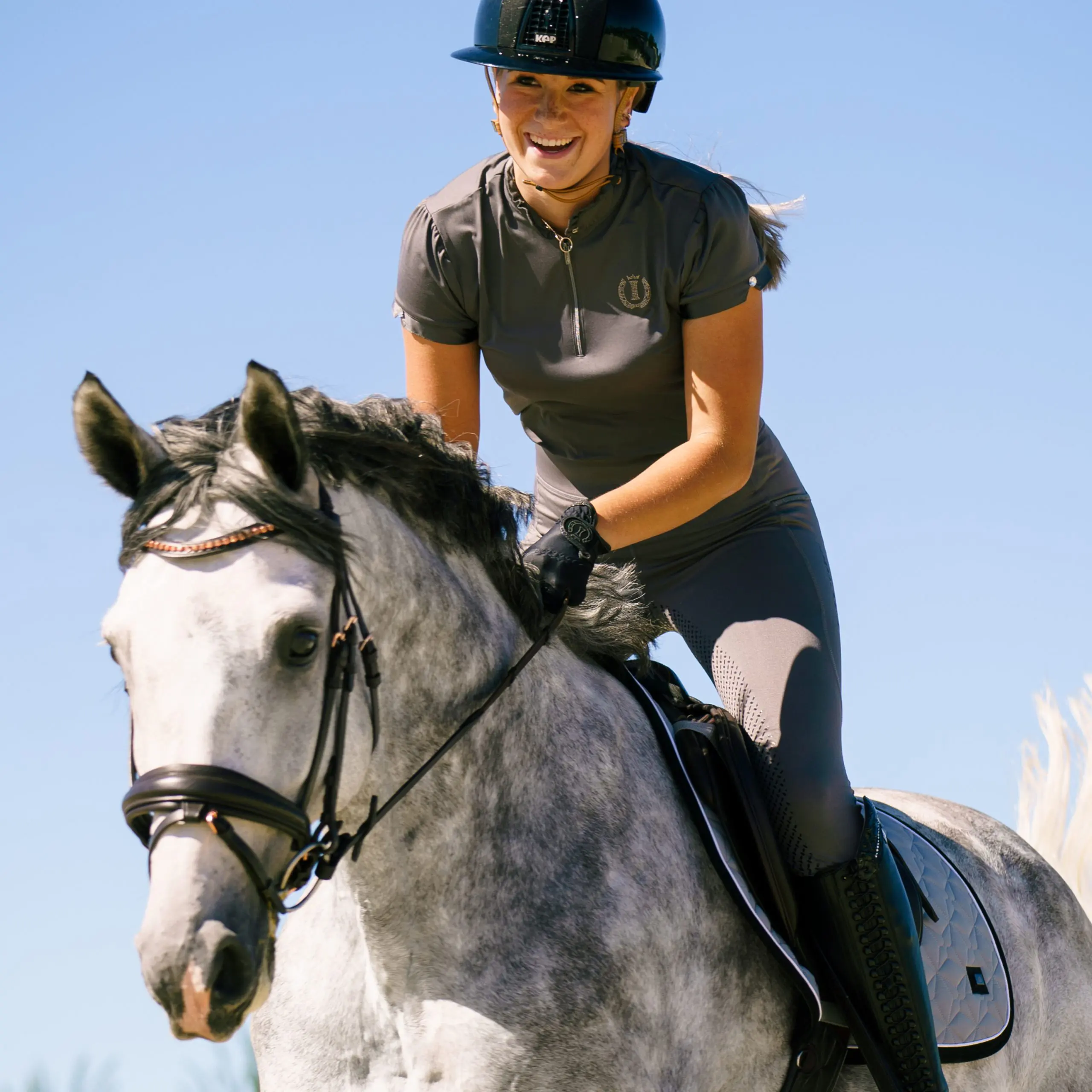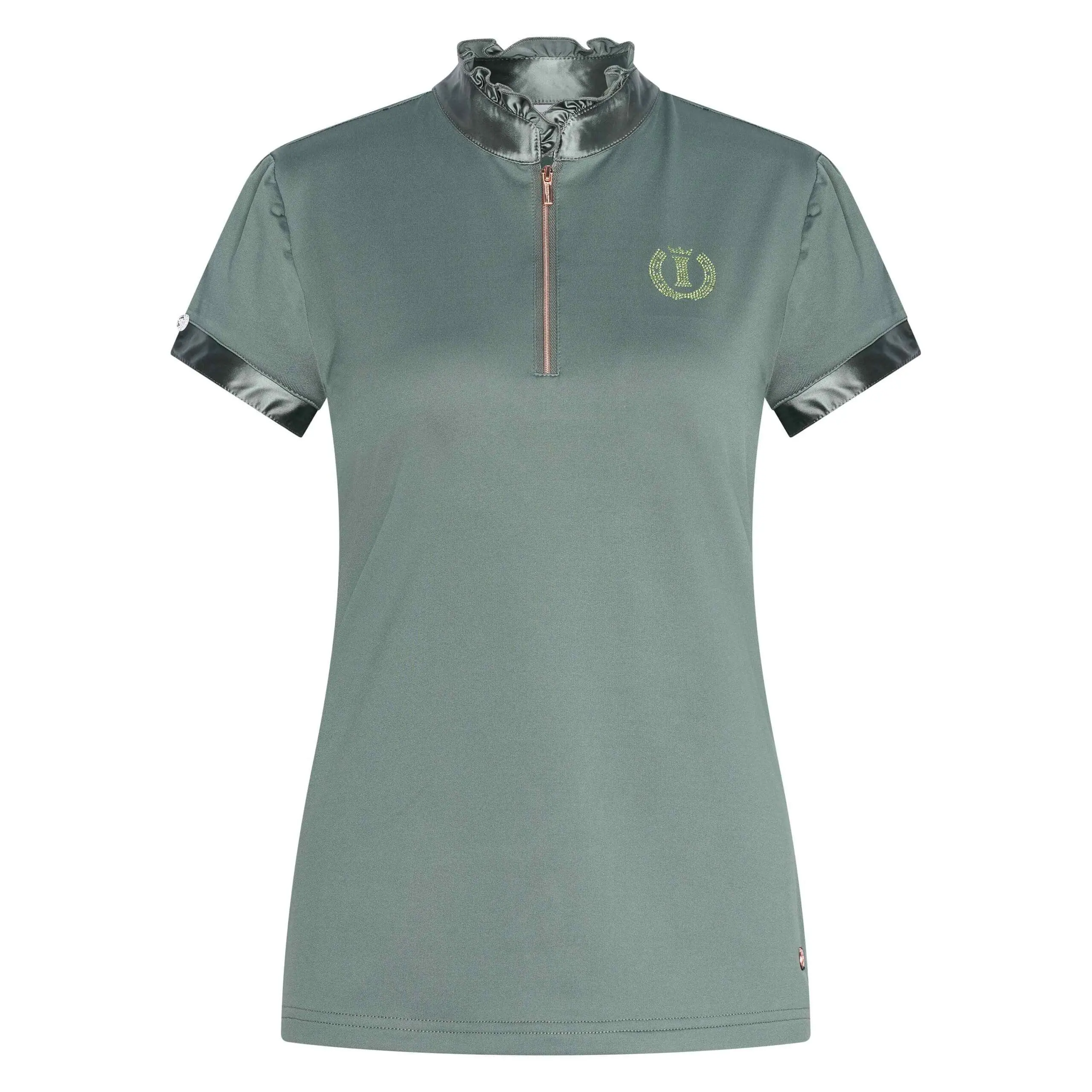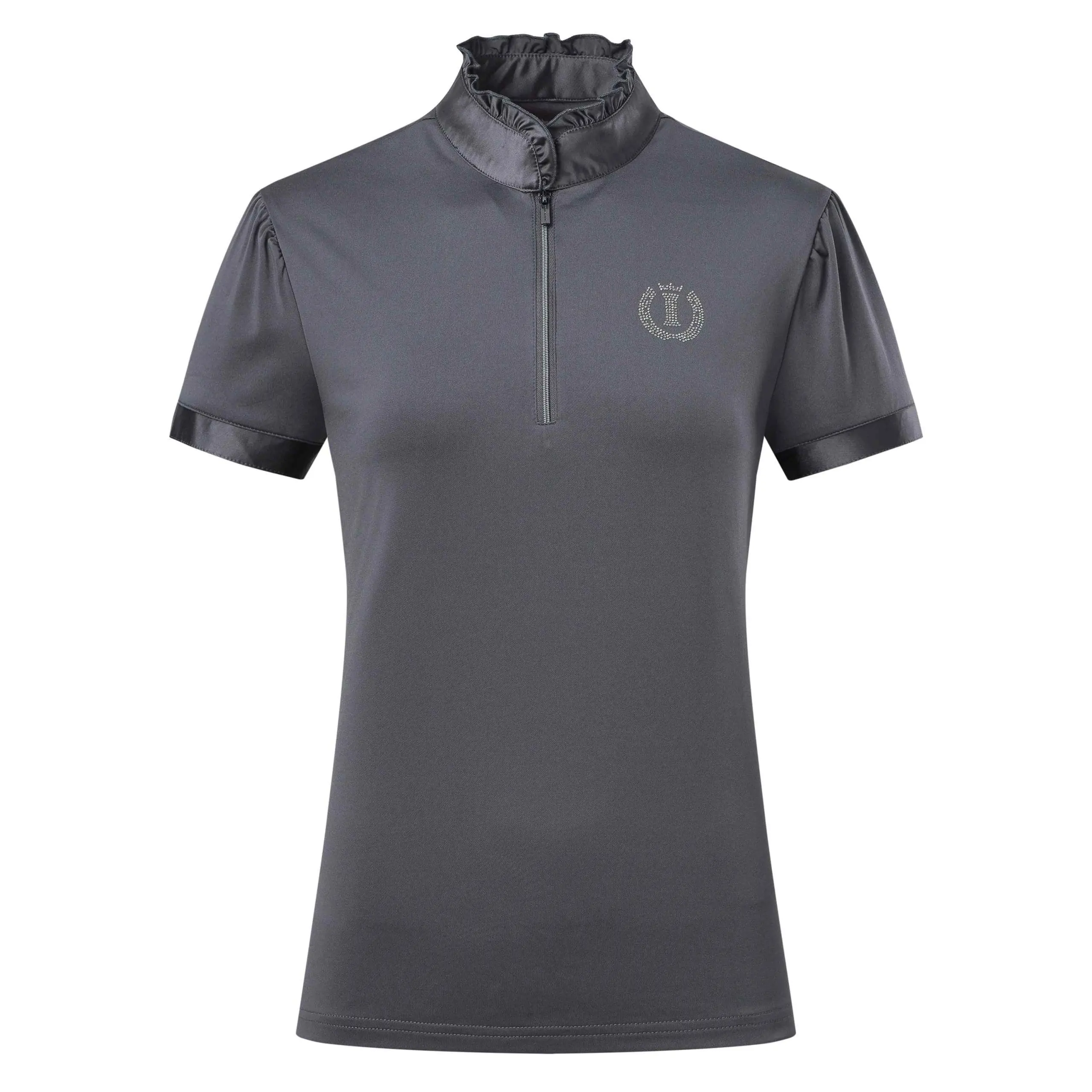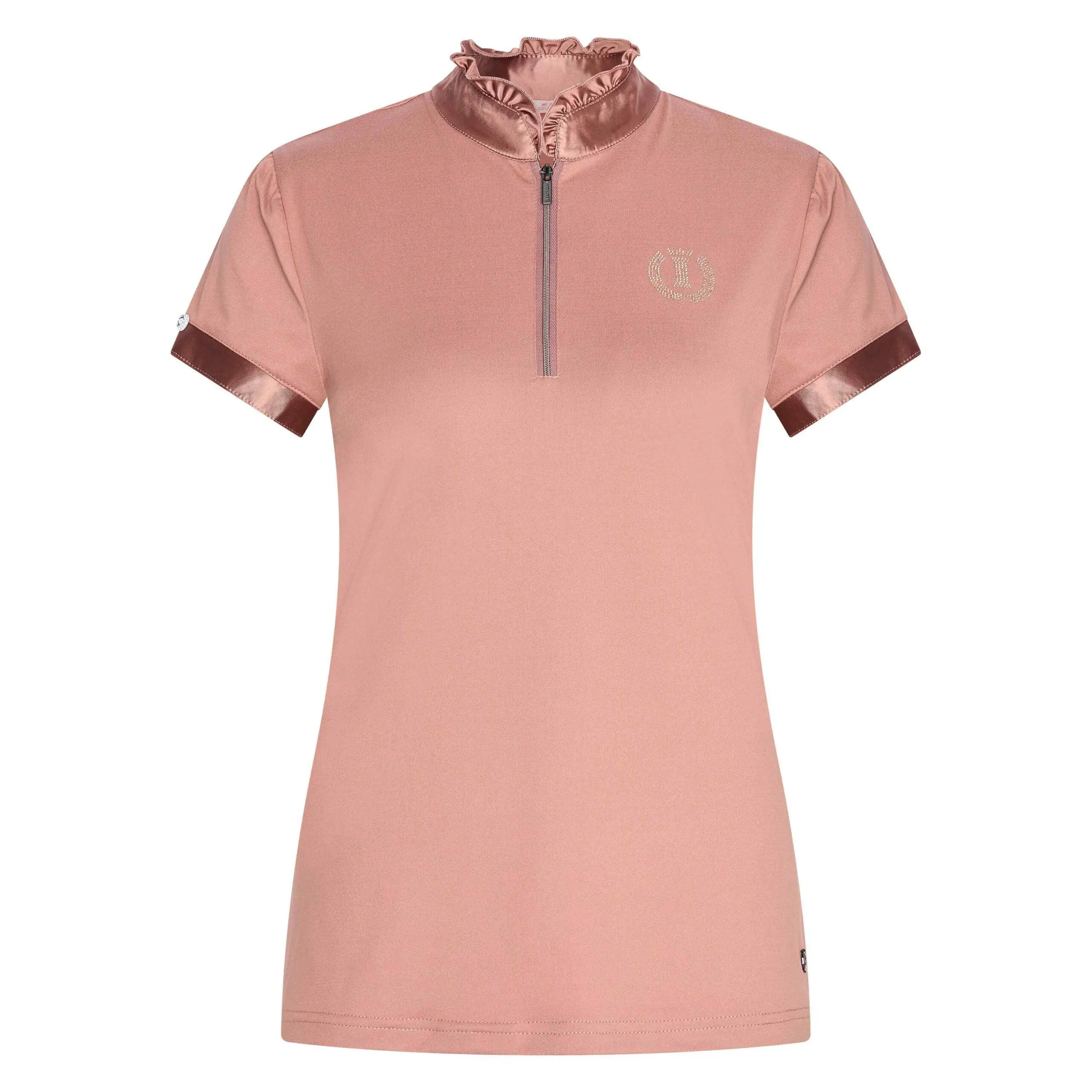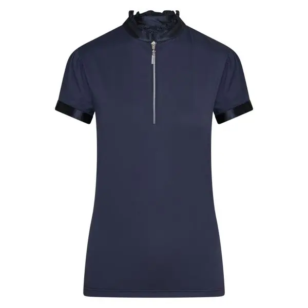 * Halfrits polo shirt * Glanzende vlakken van satijnjersey * Opstaande kraag met ruchedetail * Knoopsluiting met strass-steentjes aan de voorkant * Korte pofmouwen * Detail met strass-steentjes op de manchet * Logo van strass-steentjes op de borst