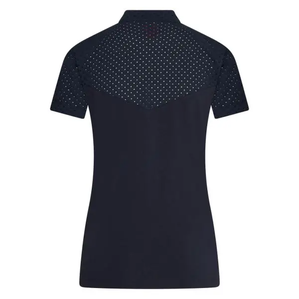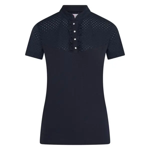 * Polo shirt * Jersey broderie anglaise met effen jerseymix * Opstaande kraag met ruchedetail * Knoopsluiting met strass-steentjes aan de voorkant * Ruchedetail bij de sluiting aan de voorkant * Metalen logobedeltje op de onderkant * Logobadge op de mouw