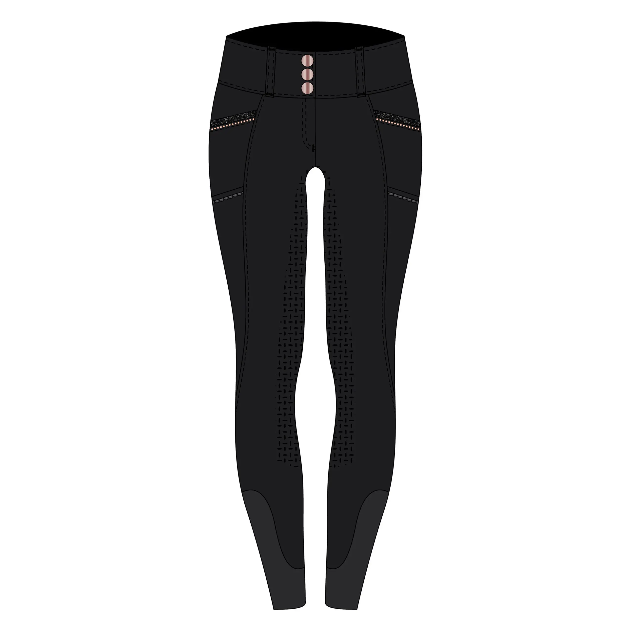 Rijbroek * 4-way stretch * Hoge taille met gulp en 3 knopen * 2 telefoonzakken * 2 klepknopen aan de achterkant * Glittertape aan de bovenkant van de zakken * Ruche aan de onderkant van de telefoonzak en zakklep * Siliconen zitvlak * Elastaan inzetstukken zoom