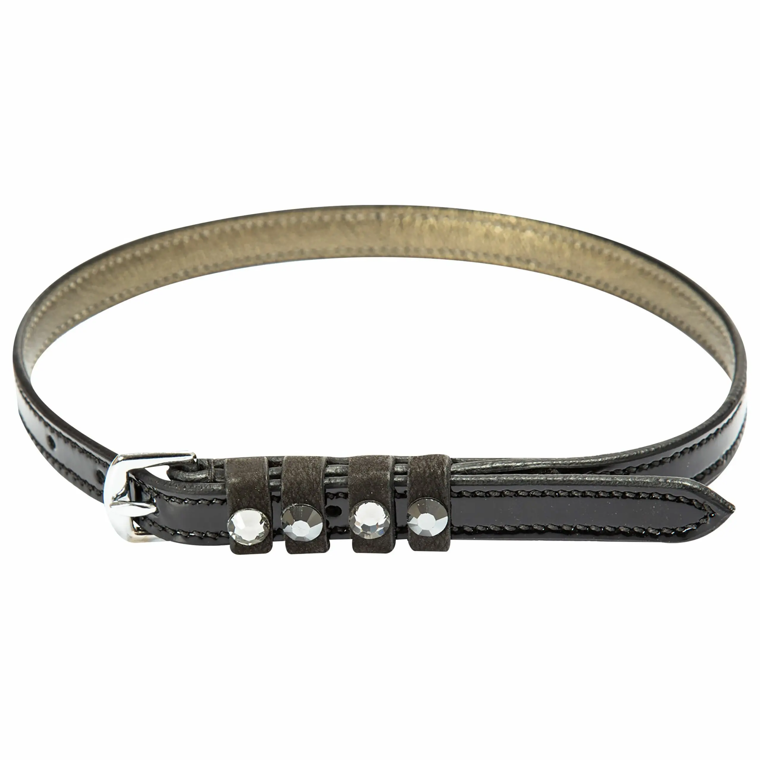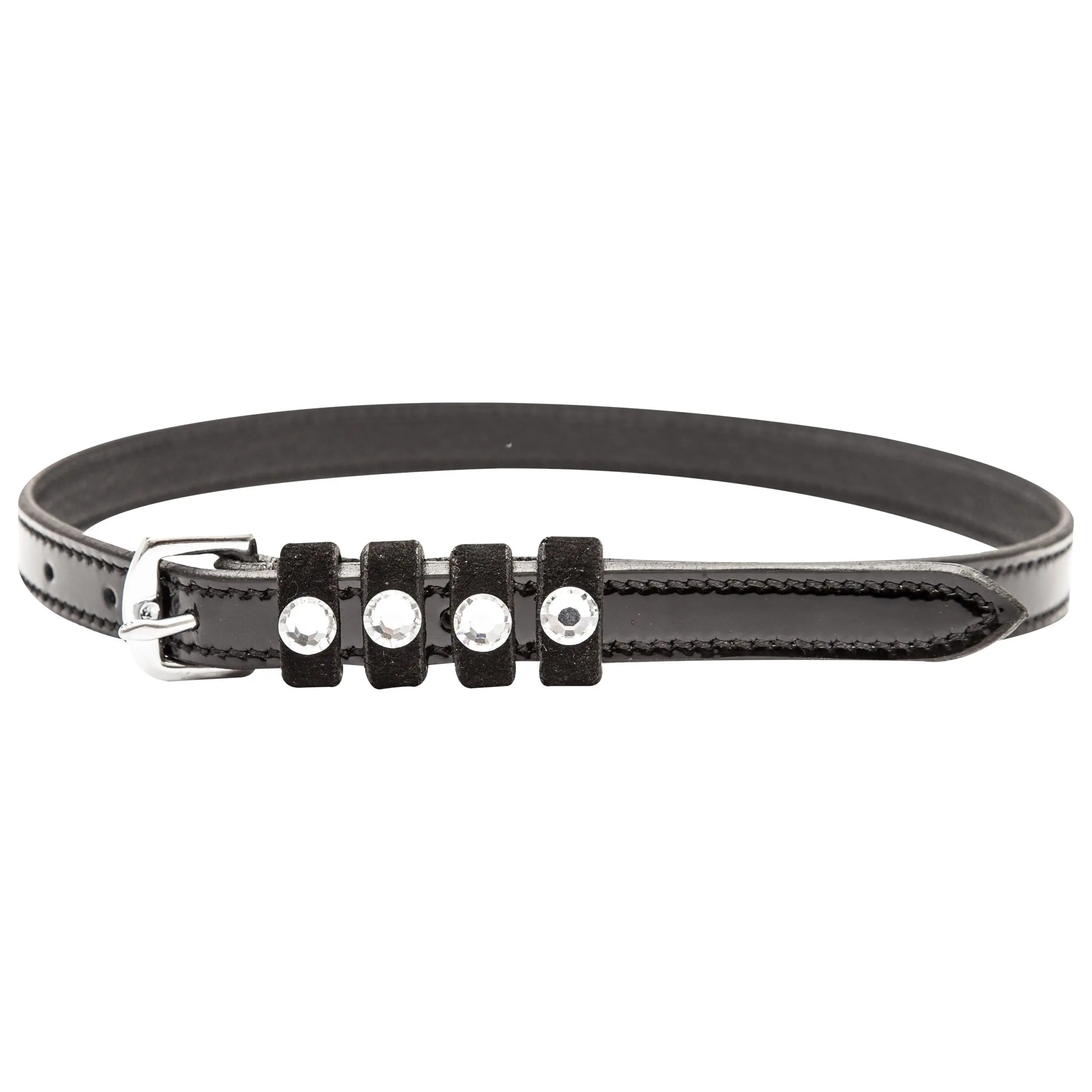 Pardouz spur straps of beautiful quality leather and luxurious appearance by the patent leather accents and the inserts with strass stones. By pair. Length 52cm, holes start at 38cm.