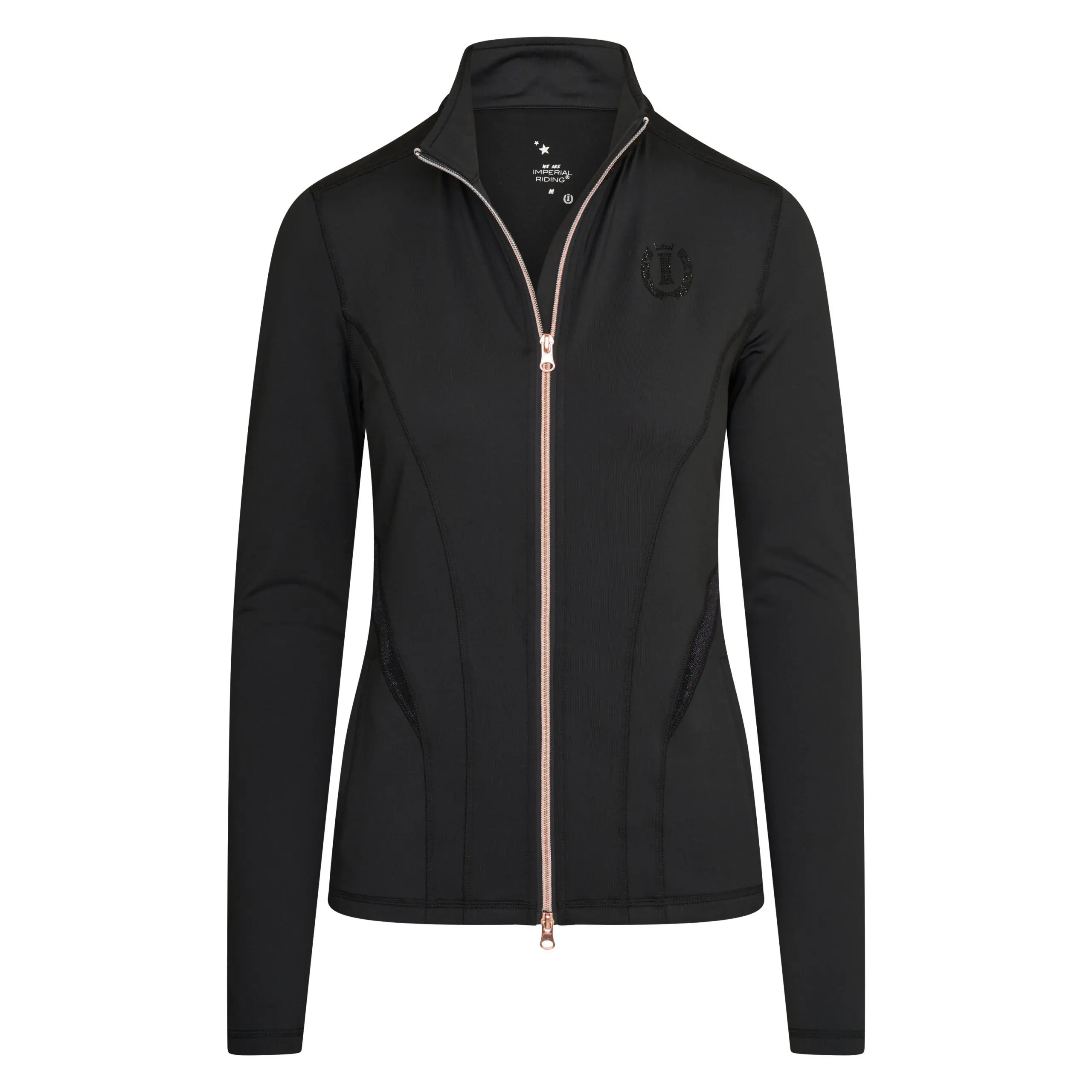 Prachtige technische cardigan met stikwerk in metallic kleuren. Let ook op de zijvlakken en de kraag van glanzende gaasstof. Tweewegrits midden op de voorkant en glanzend steentjesartwork op de linkerborst.