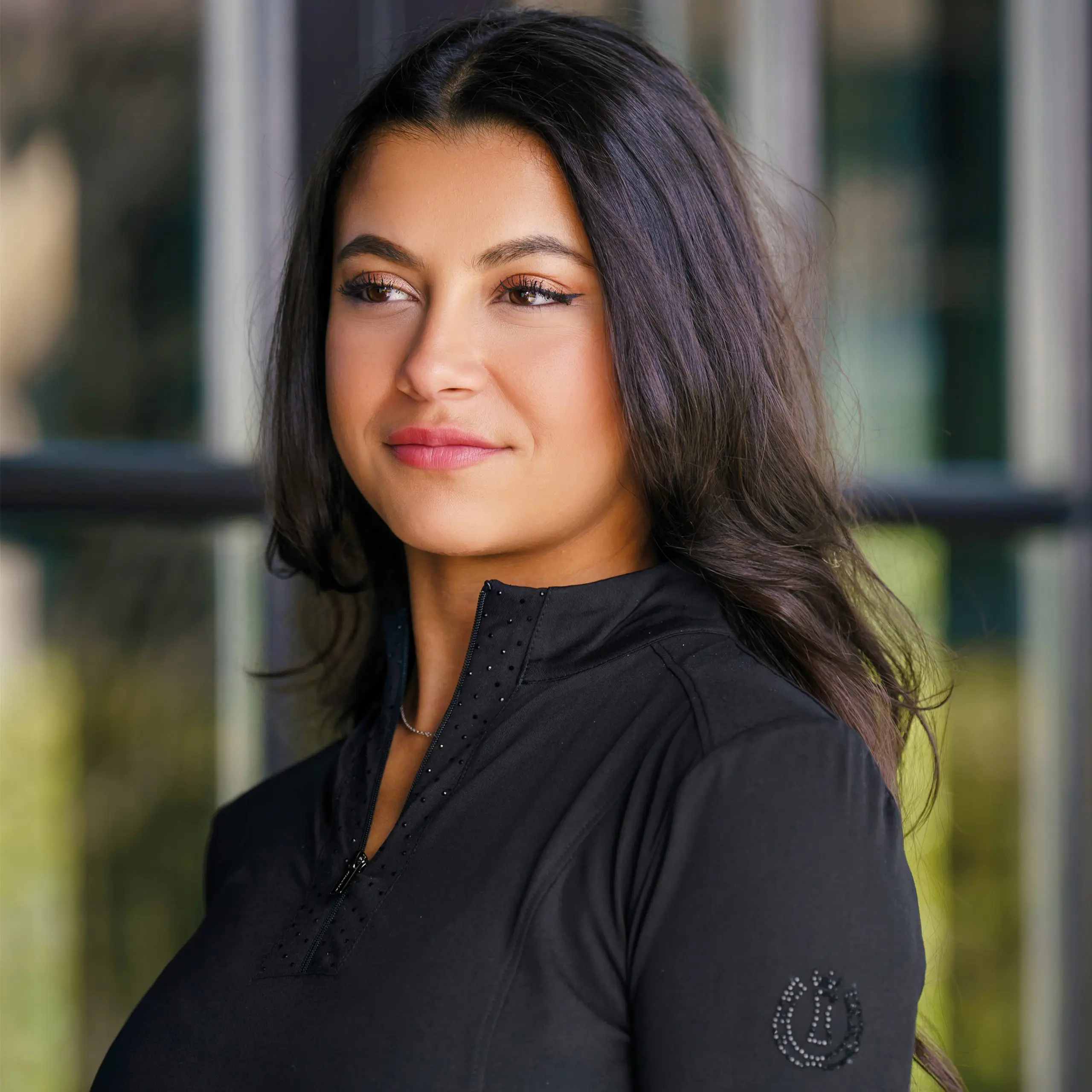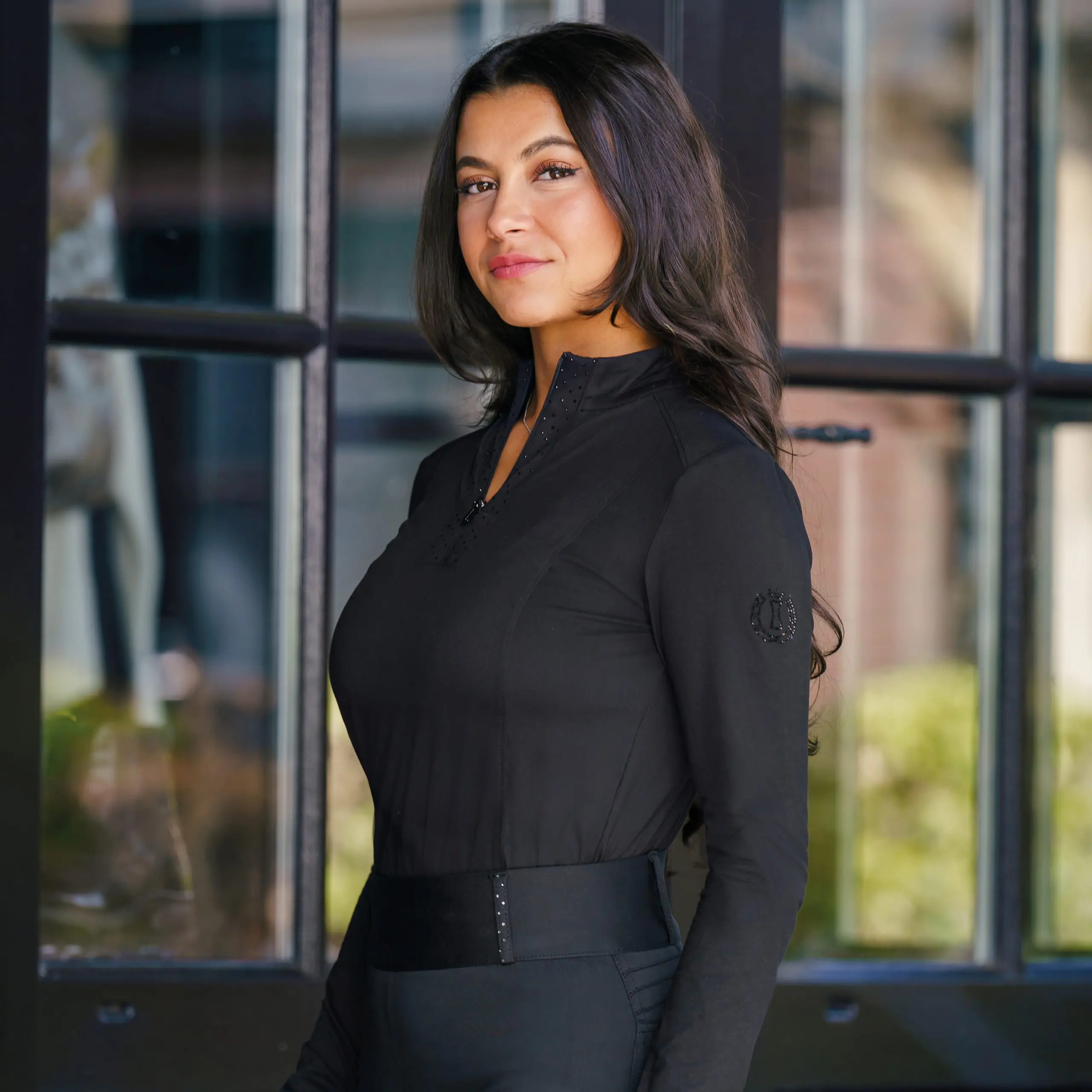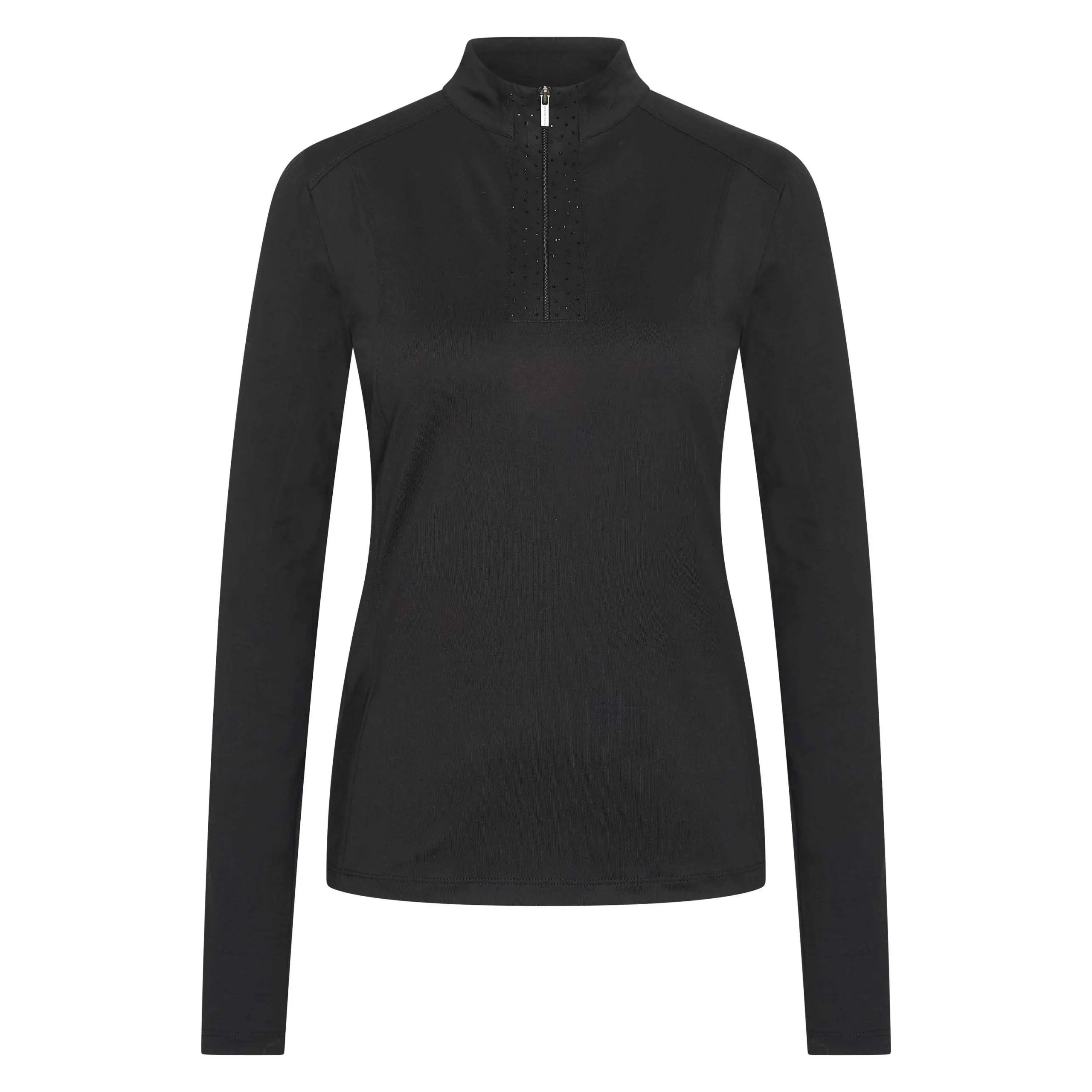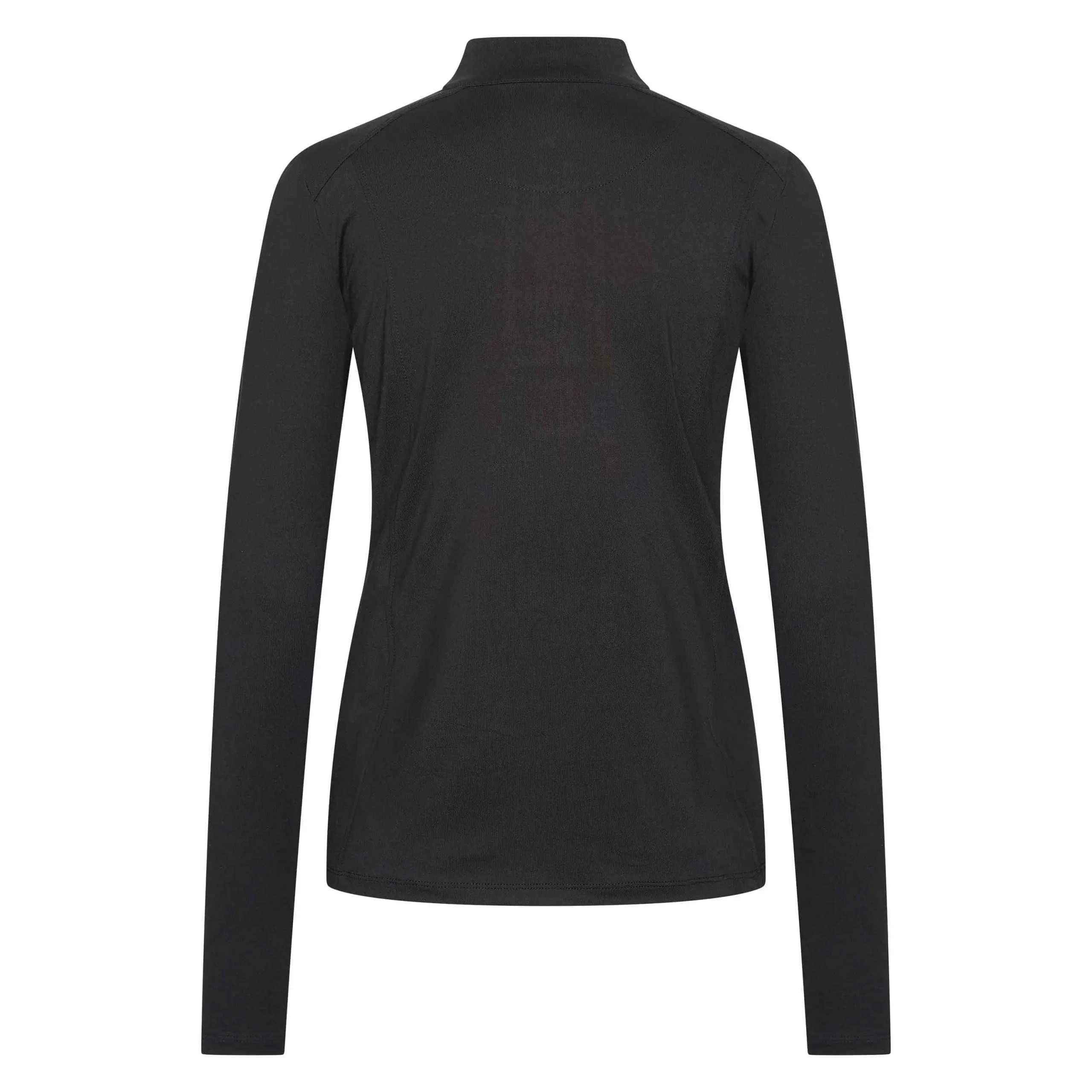 Top in zeer zachte jersey met halve ritssluiting * Kraagstand * Naast de rits aan beide zijden plakband met zwarte strass-steentjes * Op de linkerbovenarm een kleurmatch rhinestone-logo * Lange mouwen * Stof is aan de binnenkant geborsteld