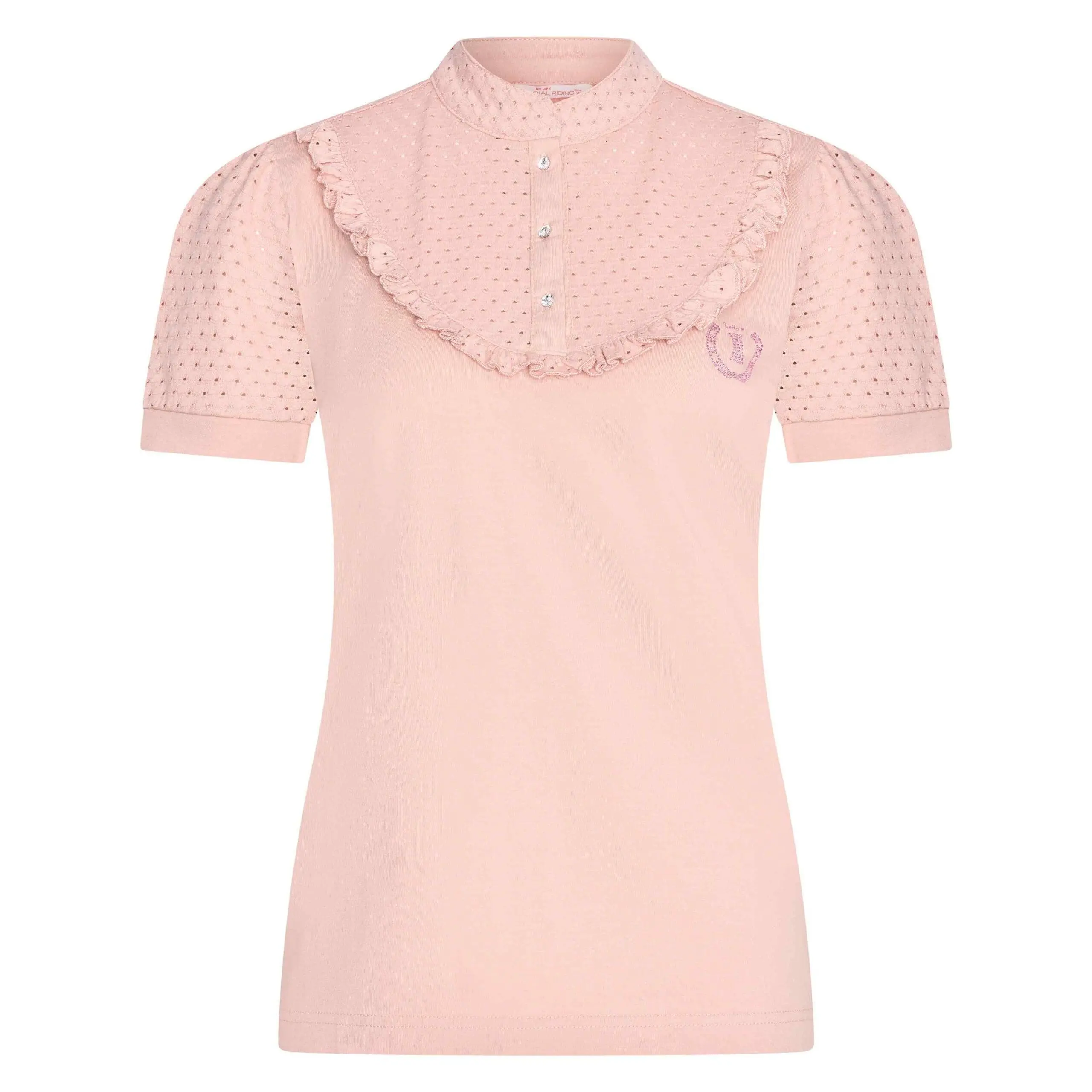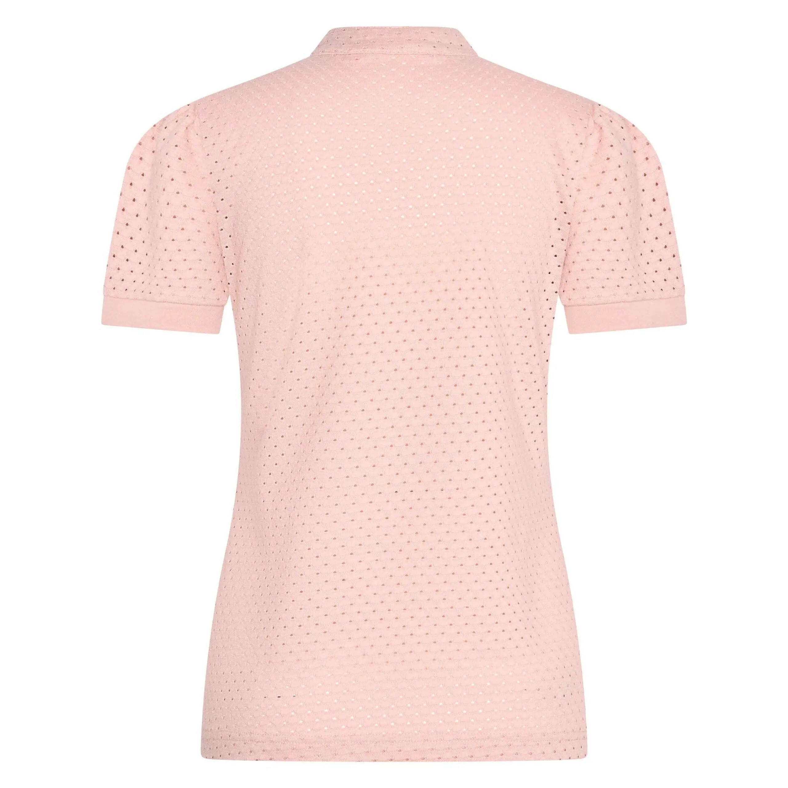 Jersey broderie anglaise top * Korte pofmouwen * Manchet met split en kristallen knoop * Effen jersey inzetstuk aan de voorkant * Opstaande kraag * Kristallen knoopsluiting * Klein ruchedetail op de schouder * Metalen logo-charme onderaan * Logo op de borst