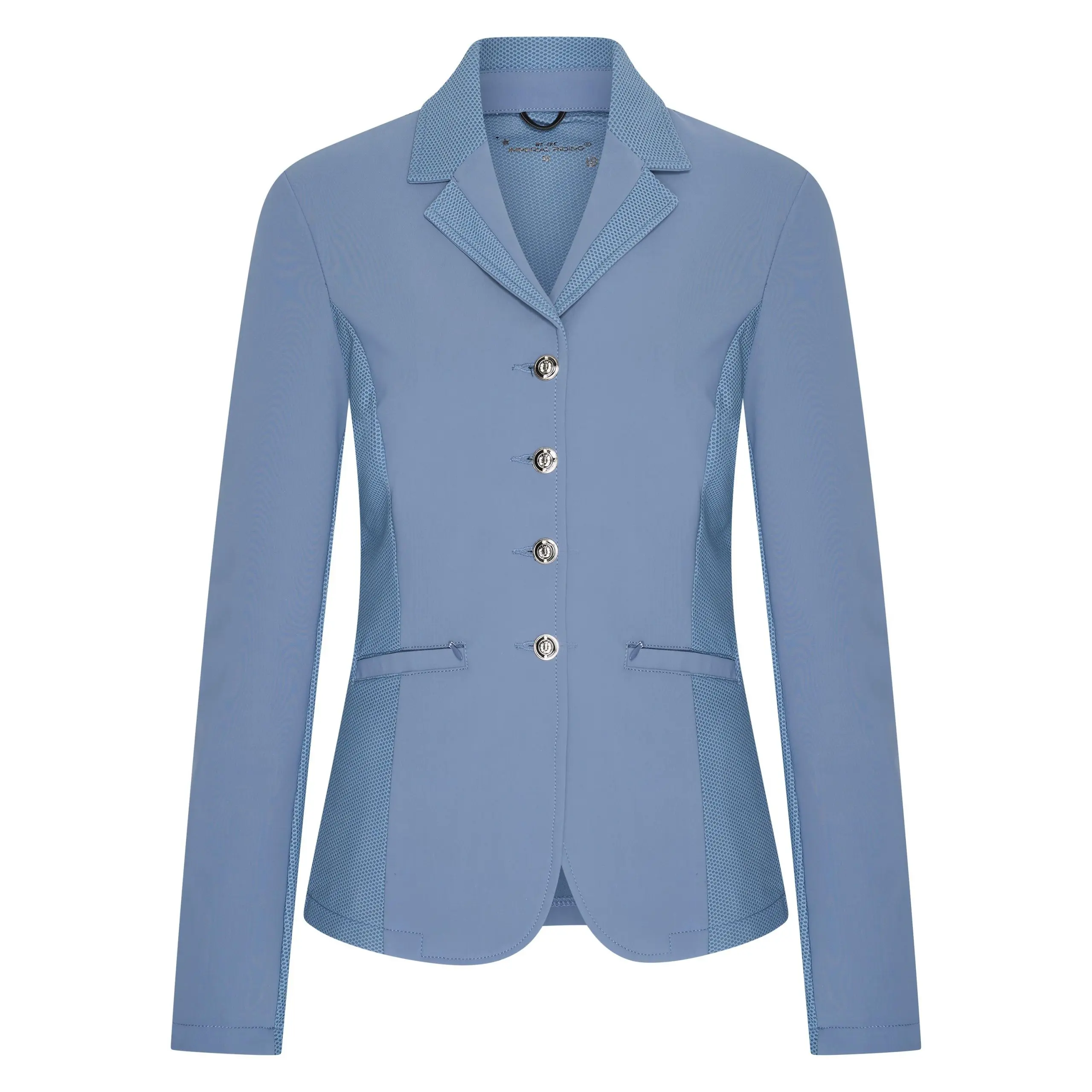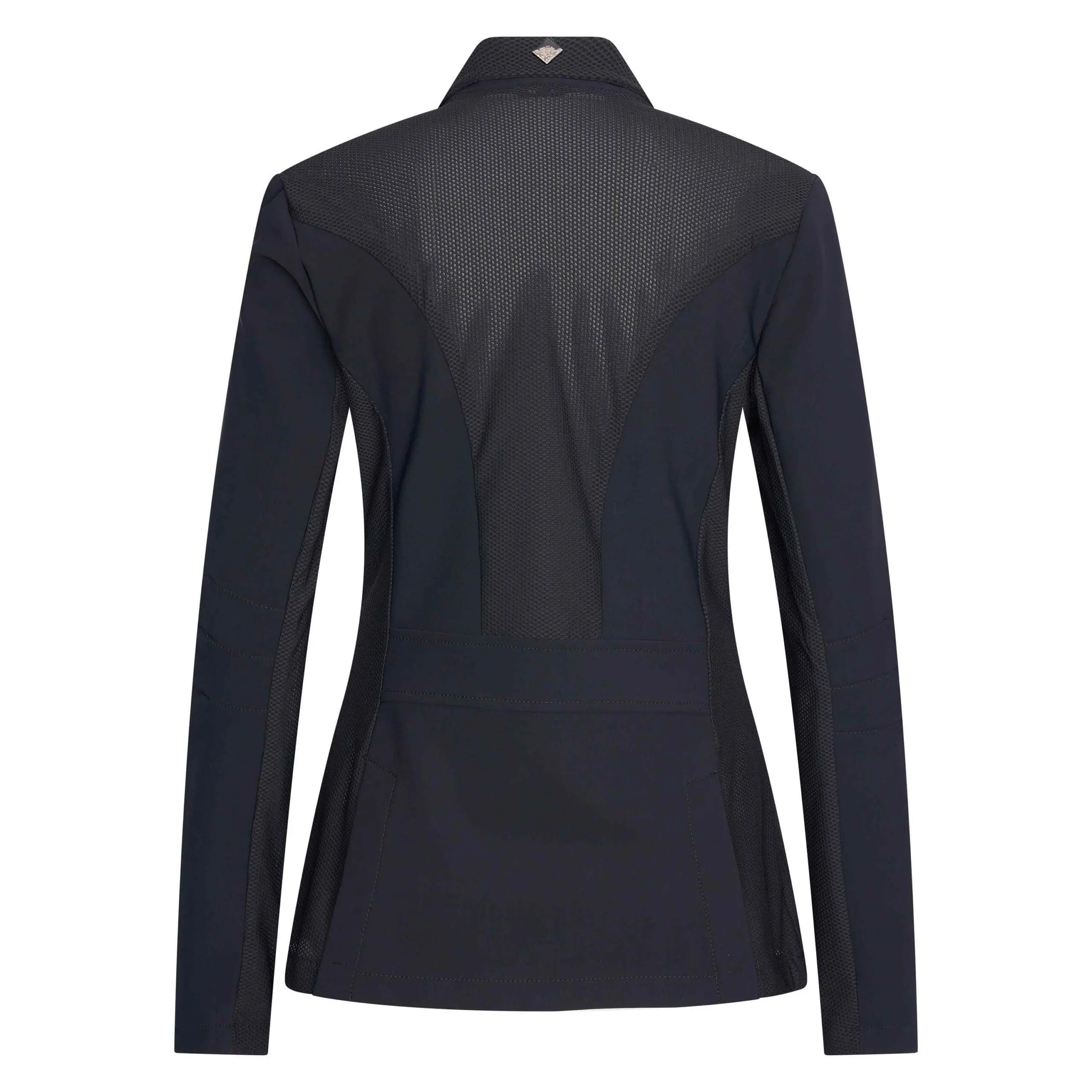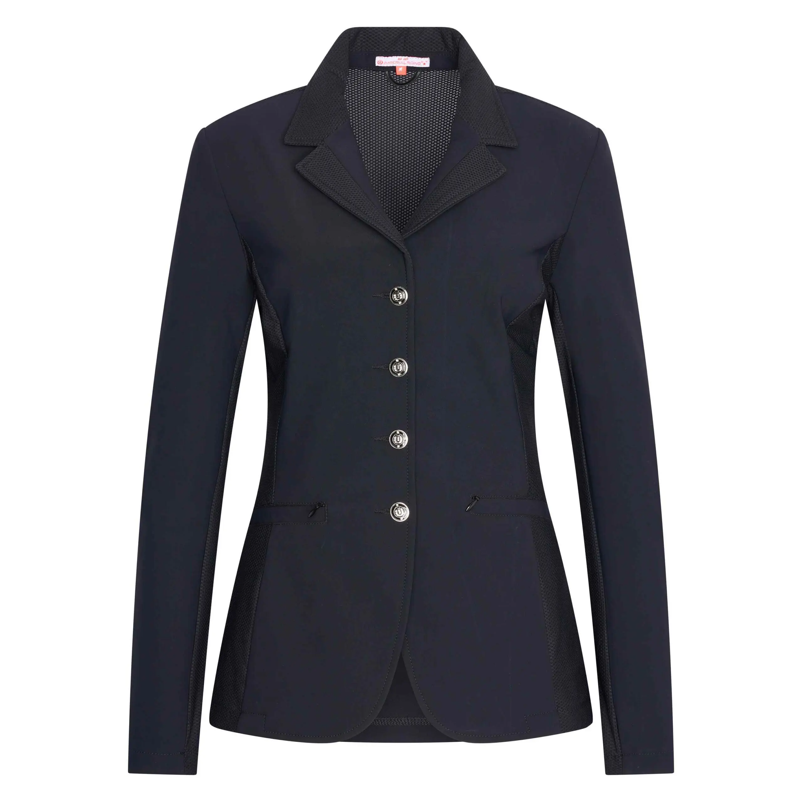 Wedstrijdblazer met afgedekte rits CF en 4 zichtbare metalen merkknopen * 4 Way stretch stof gecombineerd met mesh * 2 enkele paspelzakken met glittertape en strass steentjes afgesloten met blinde rits * Gevoerd met stretch voering * Bij CB in taillenaden met strass * 2 Splitten in rugdeel * Gevormde mouwen