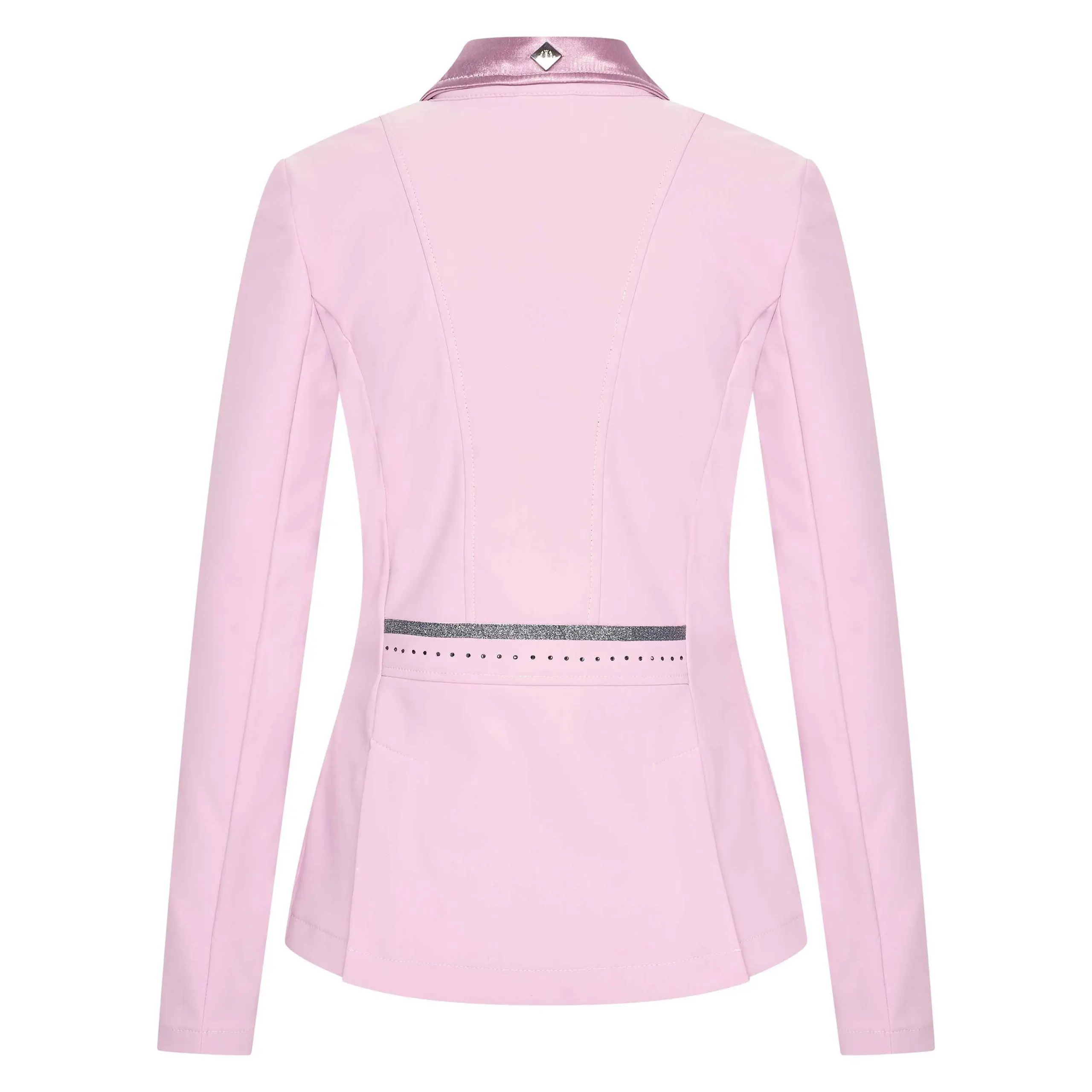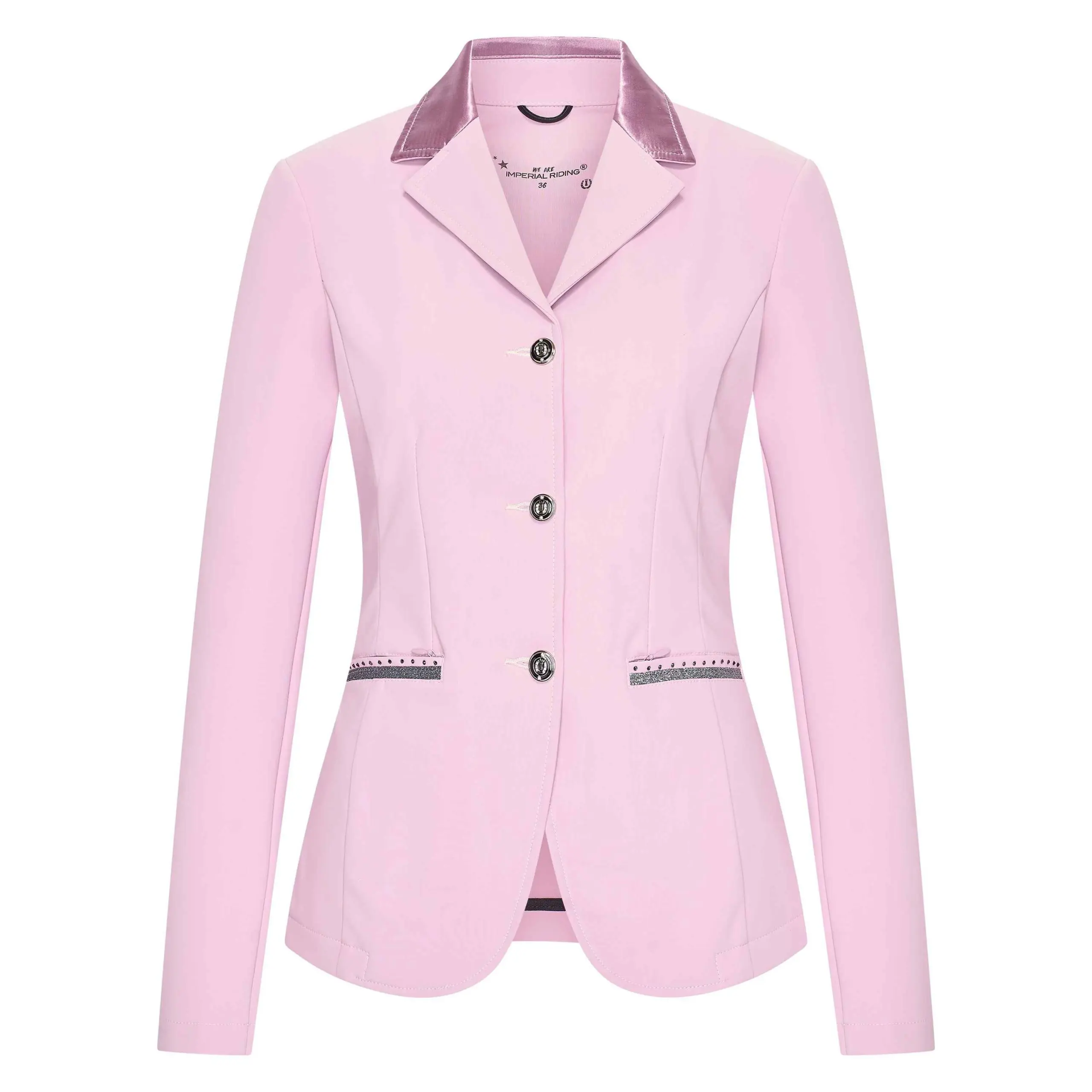Wedstrijdblazer met afgedekte rits CF en 3 zichtbare knopen * 2 enkele paspelzakken met glittertape en strass steentjes gesloten met blinde rits * Gevoerd met stretch voering * Kraag satijn met strass steentjes aan de rand * Rechts plooidetail * Bij mouwsplit een plooidetail * Aan achterkant in taille een naad met glittertape en 2 splitten * Bij CB een strass logo artwork * Op linkermouw IMPERIAL RIDING strass artwork * Knopen met strass * 4 Way stretch stof