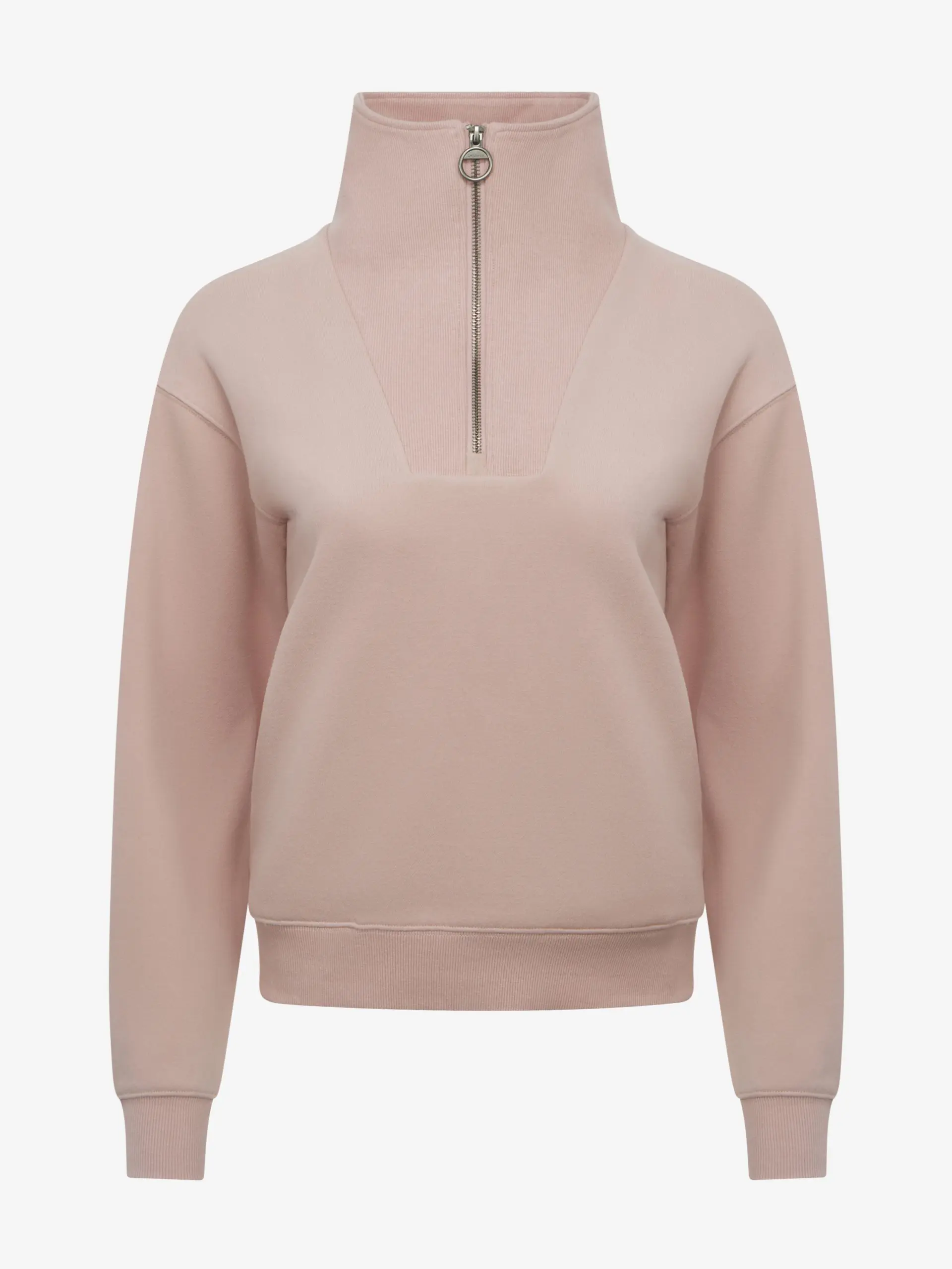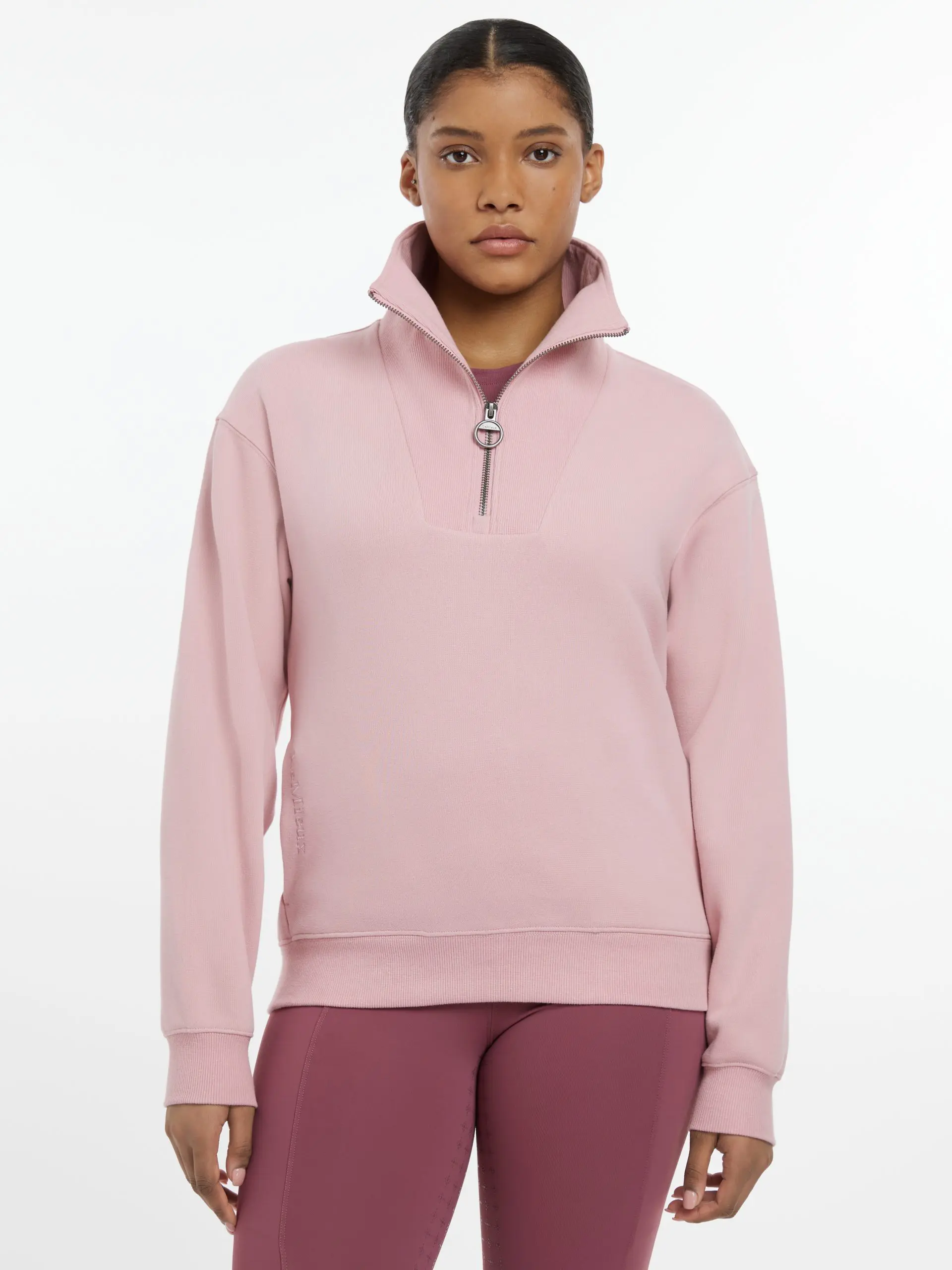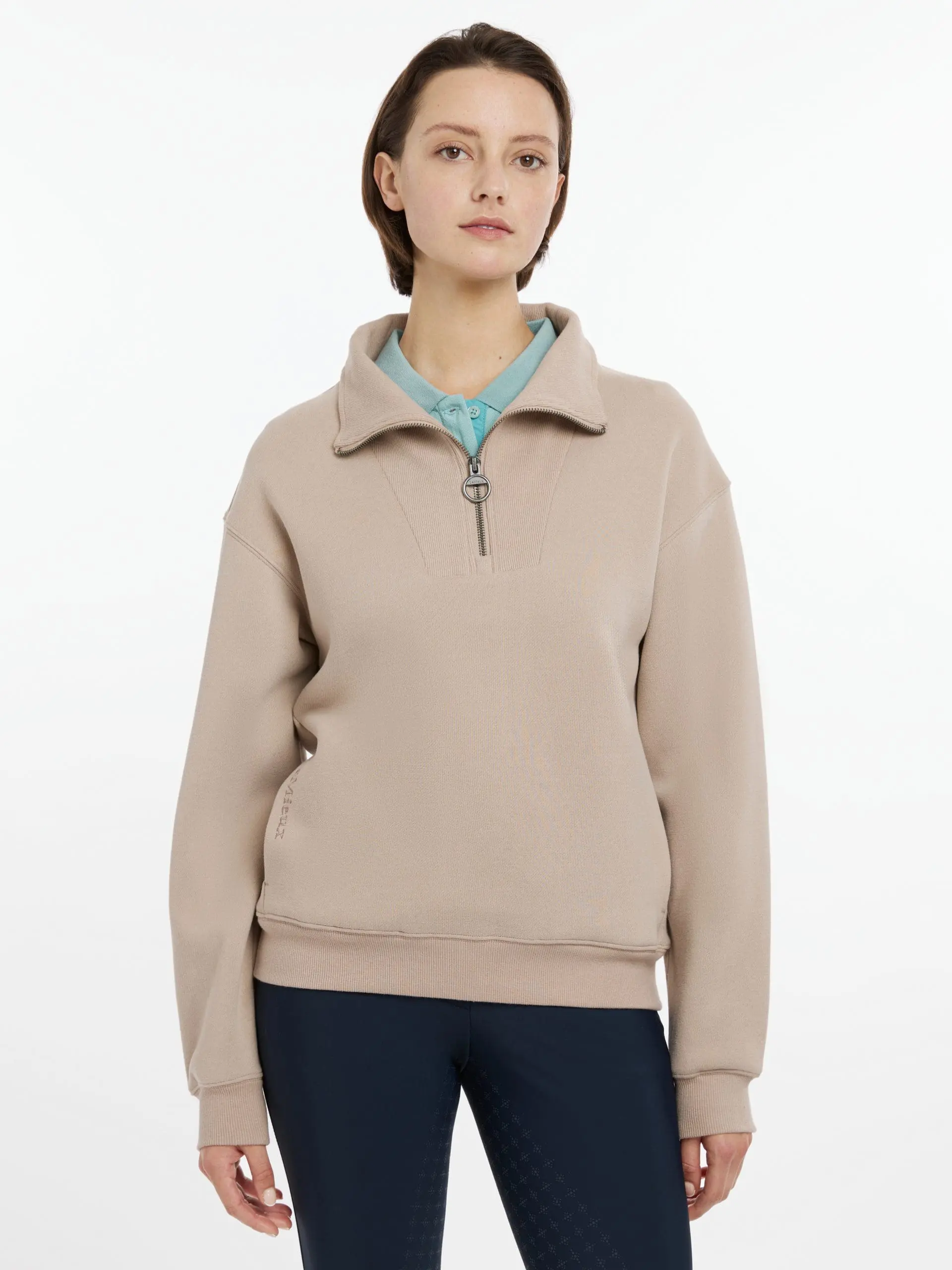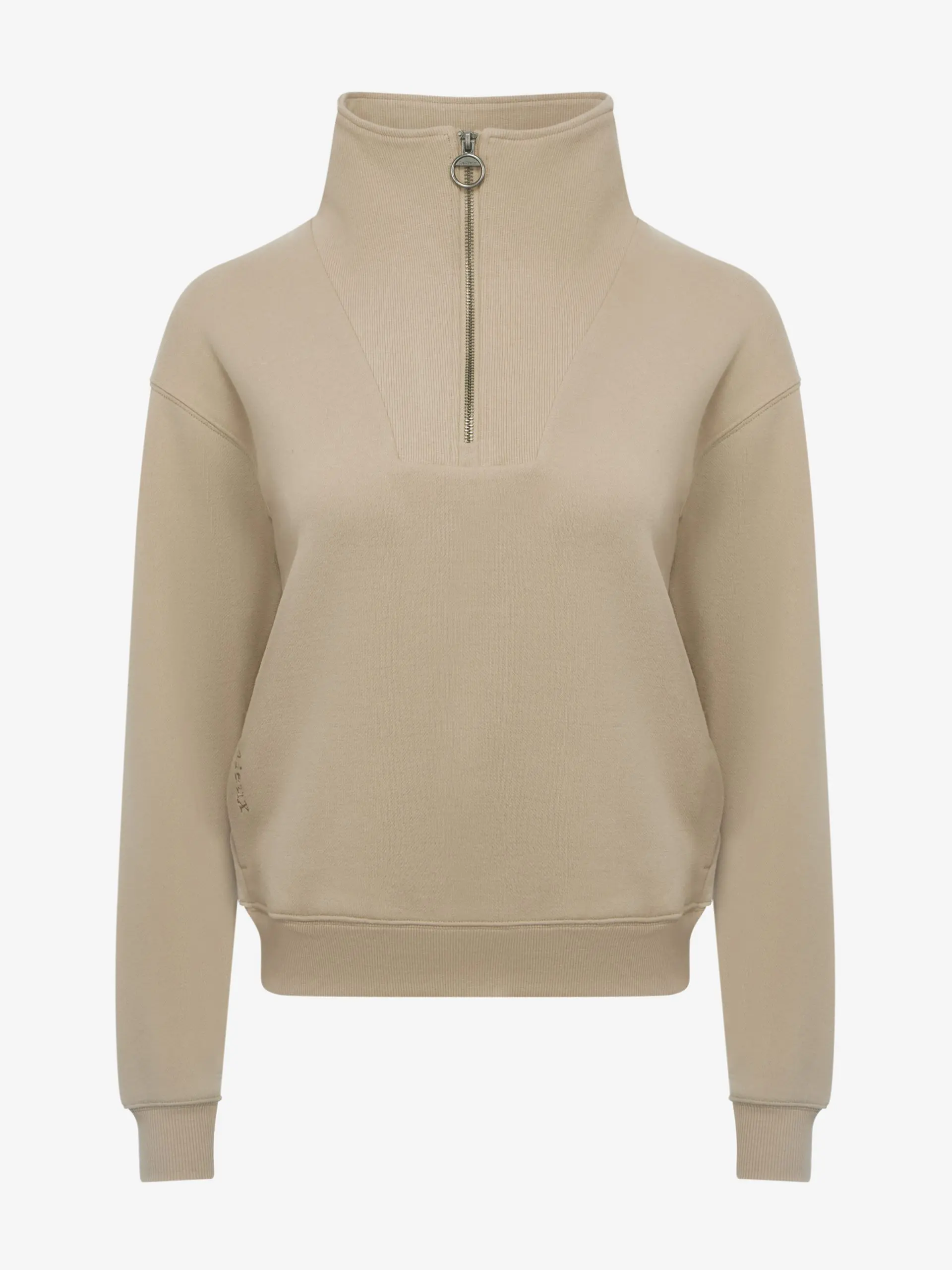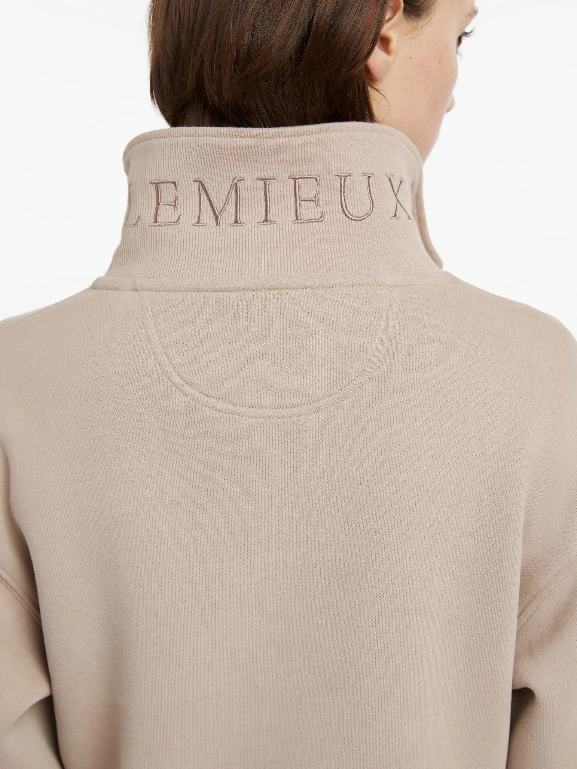 โข Omvouwbare, geribbelde kwartritskraag met LeMieux-borduursel achter in de nek. โข Relaxte stijl met verlaagde schouders. โข Zachte fleece met carbon suรจde en geborstelde achterkant โข Gemakkelijke insteekzakken aan de zijkant