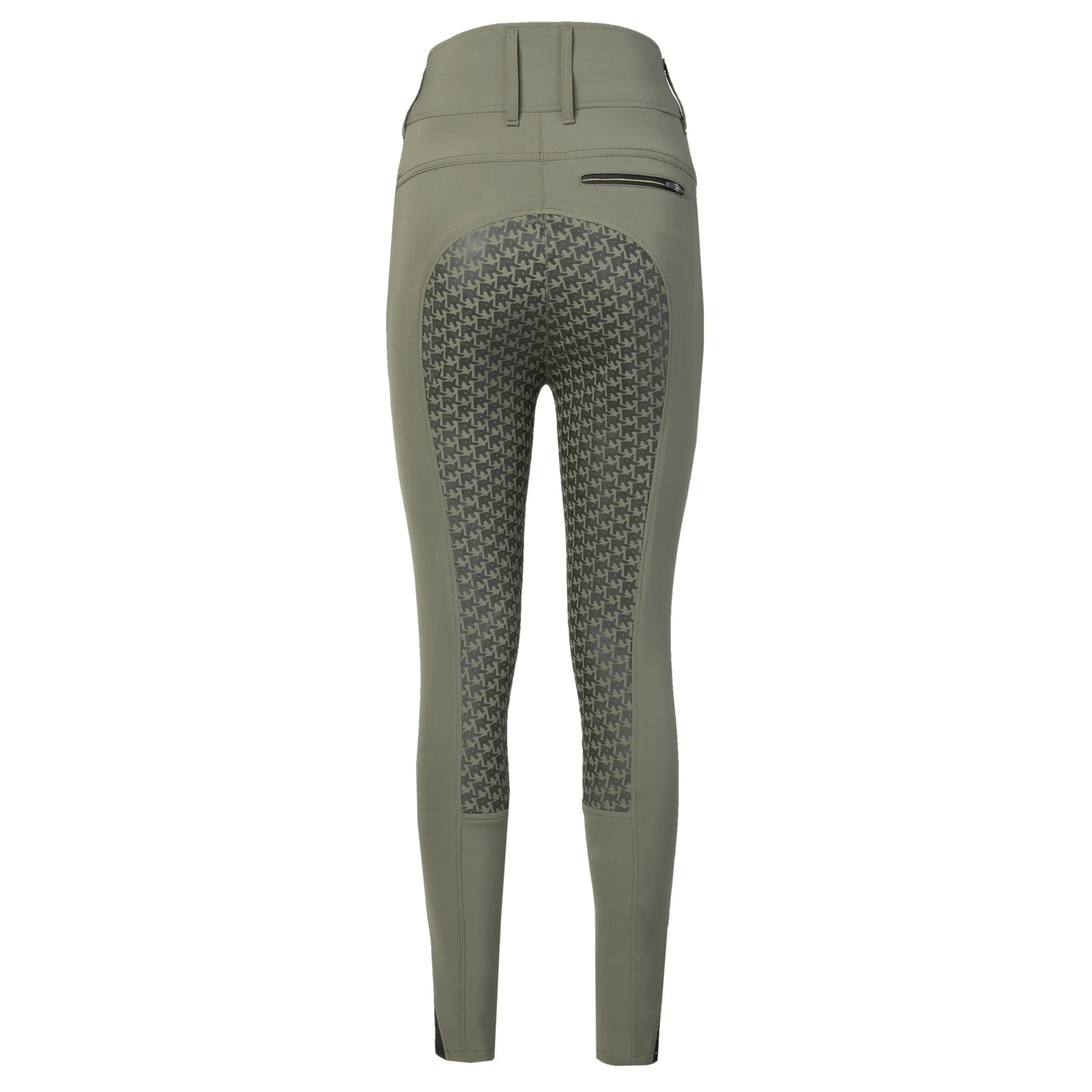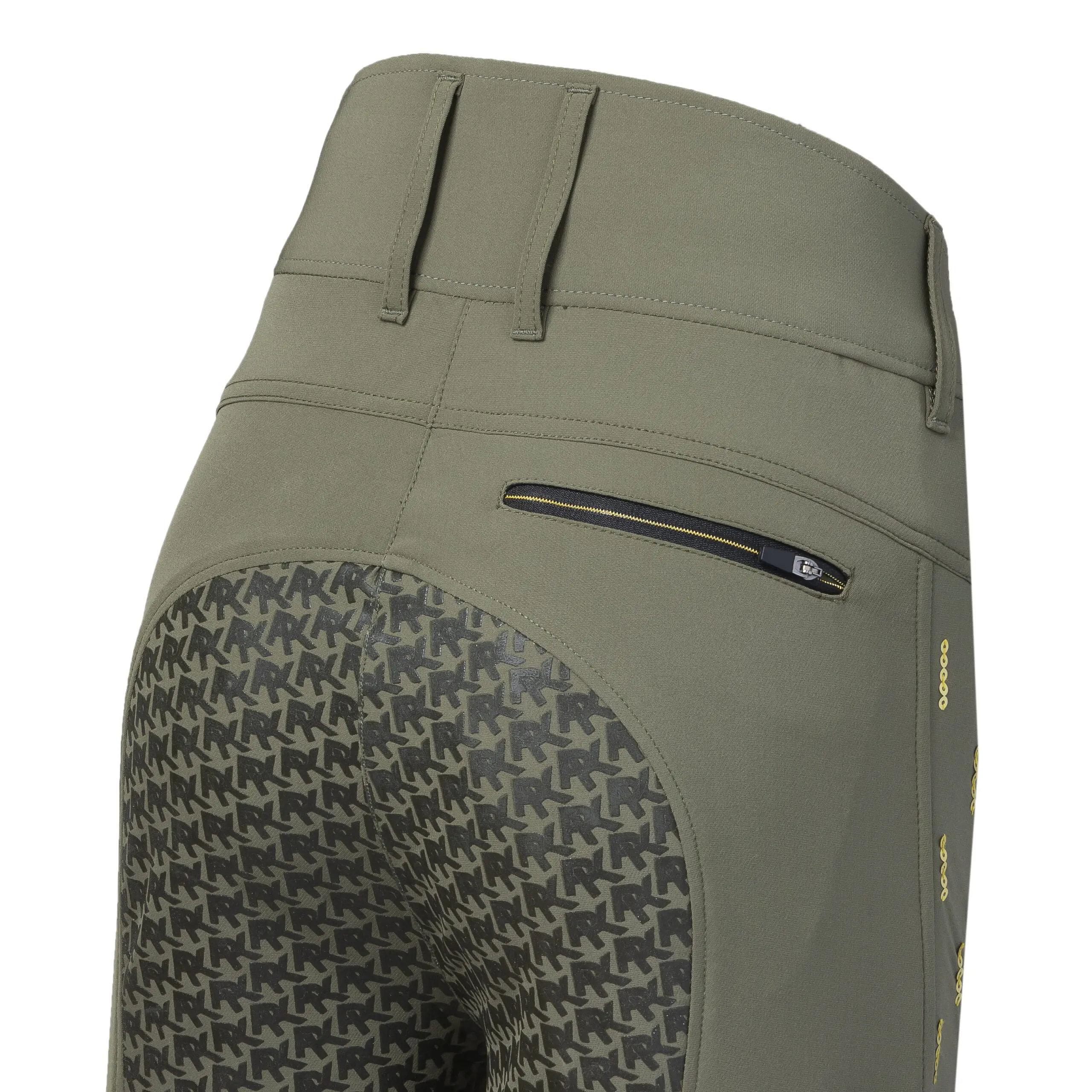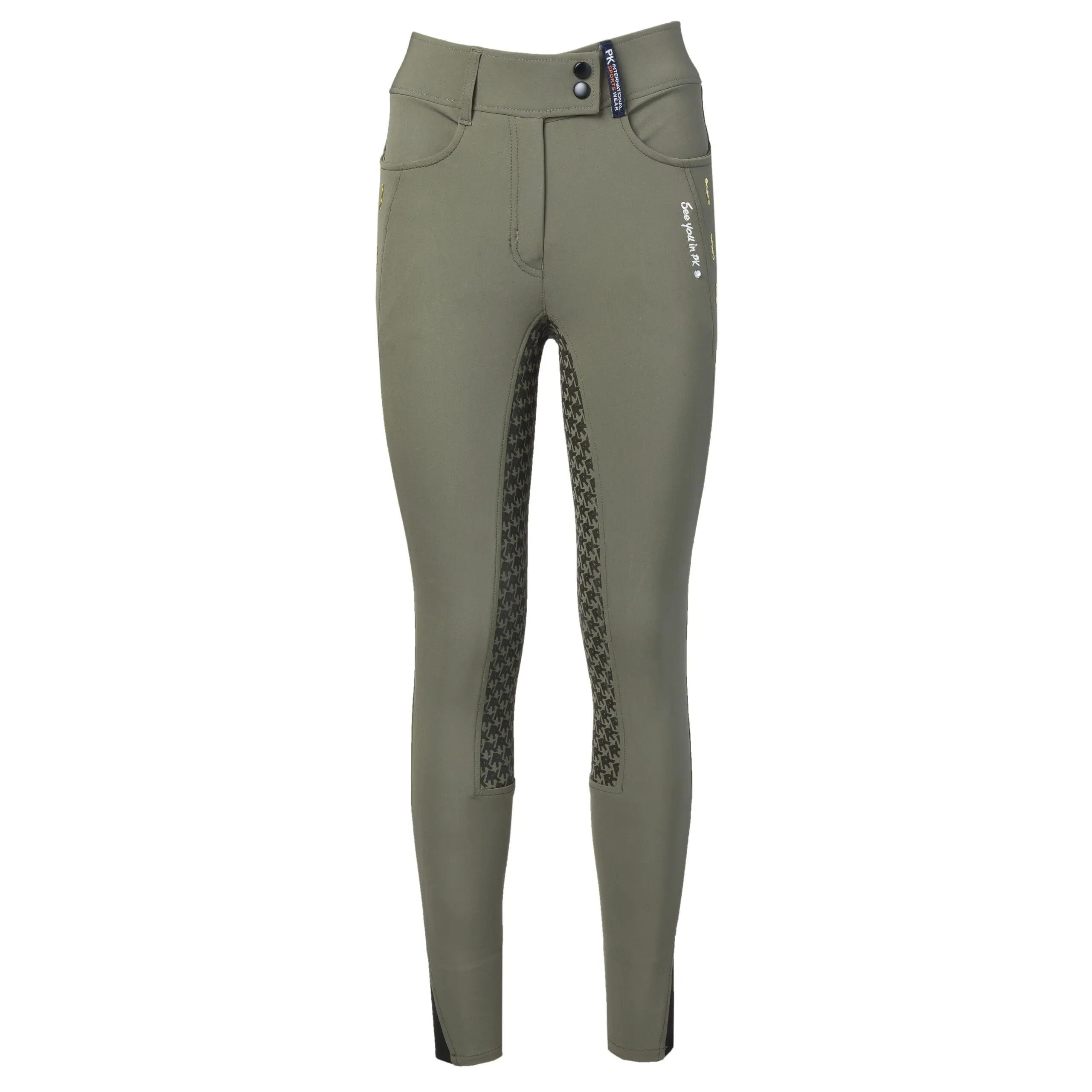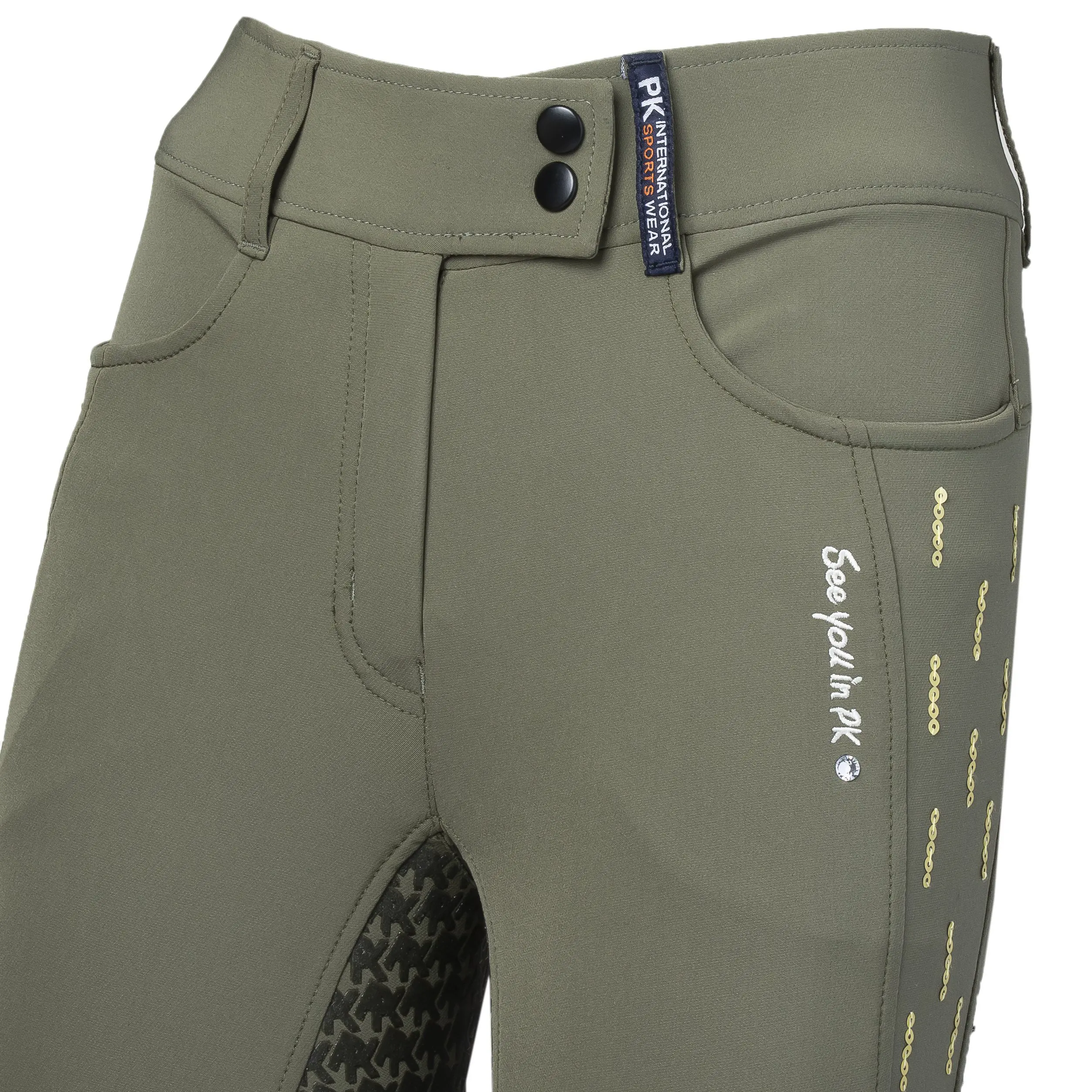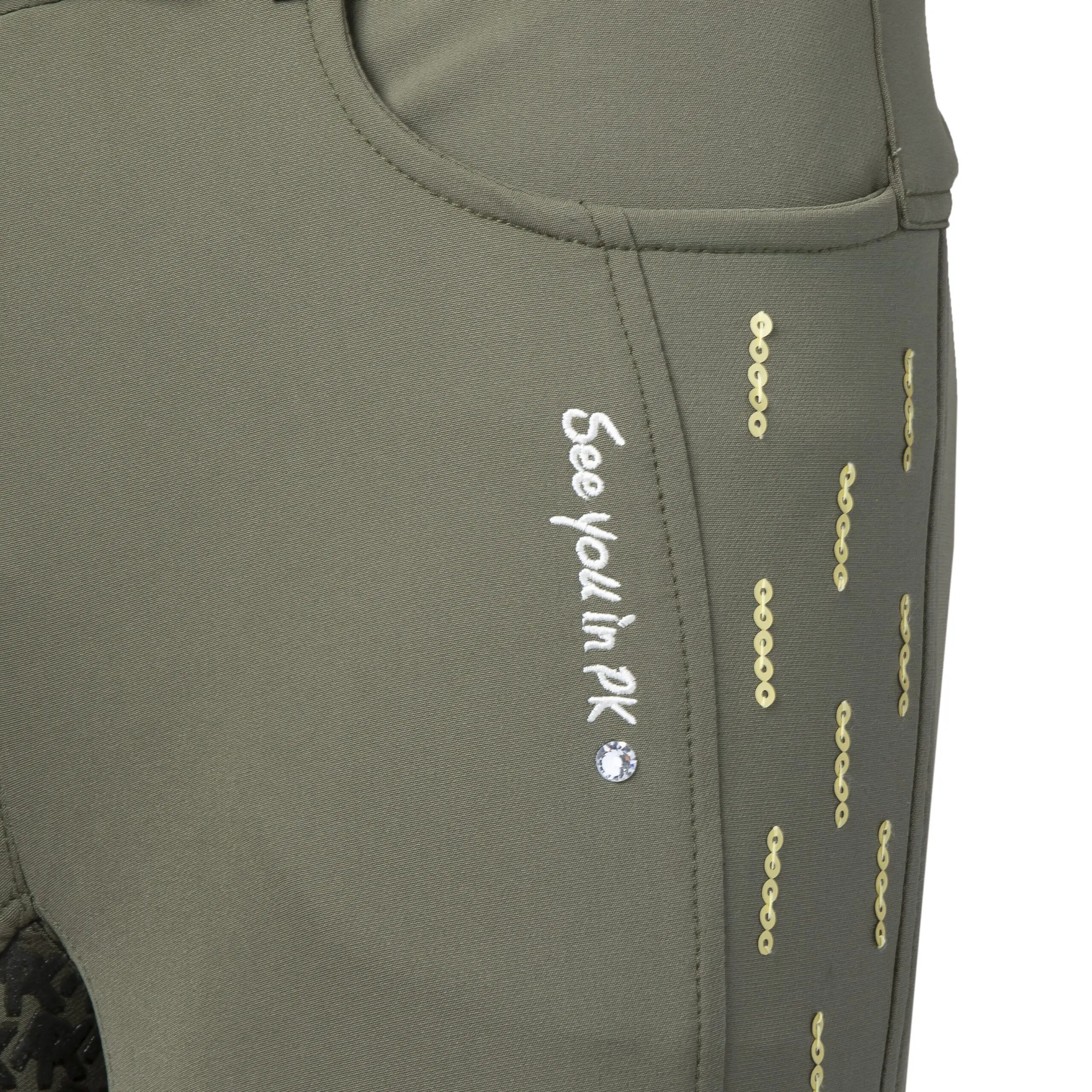 Deze technische rijbroek heeft een echte PK look en is voorzien van een wat hogere band, twee steekzakken aan de voorzijde en een gouden rits aan de achterzijde. Aan de zijkant van de broek zitten verschillende sequins. Deze broek bevat een siliconen zitvlak.