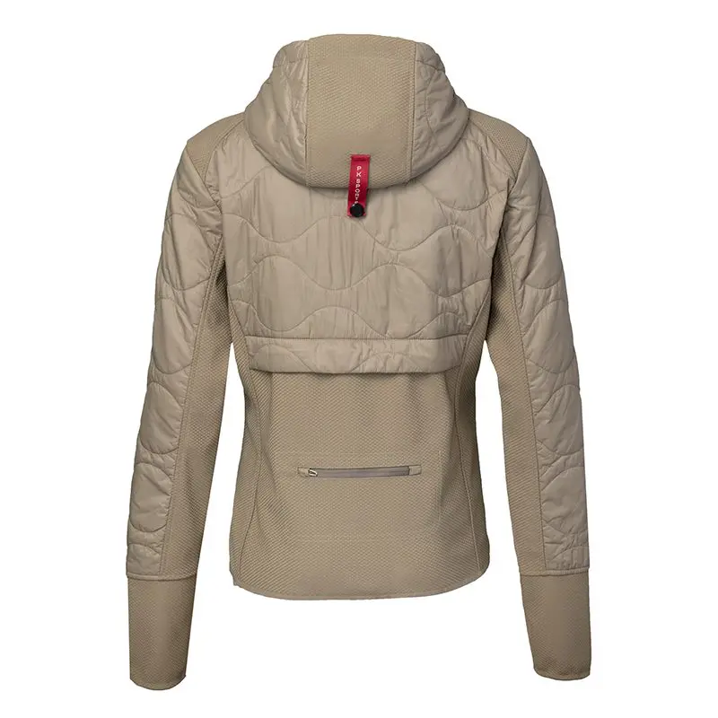 Technische lichtgewicht jas, gemaakt met twee verschillende stoffen; een glimmende nylon en ademende mesh stof. Uitgewerkt met capuchon, button om de capuchon vast te zetten, zakken met rits op de voorkant en een klein zakje op de achterkant. Afgewerkt met PK details.