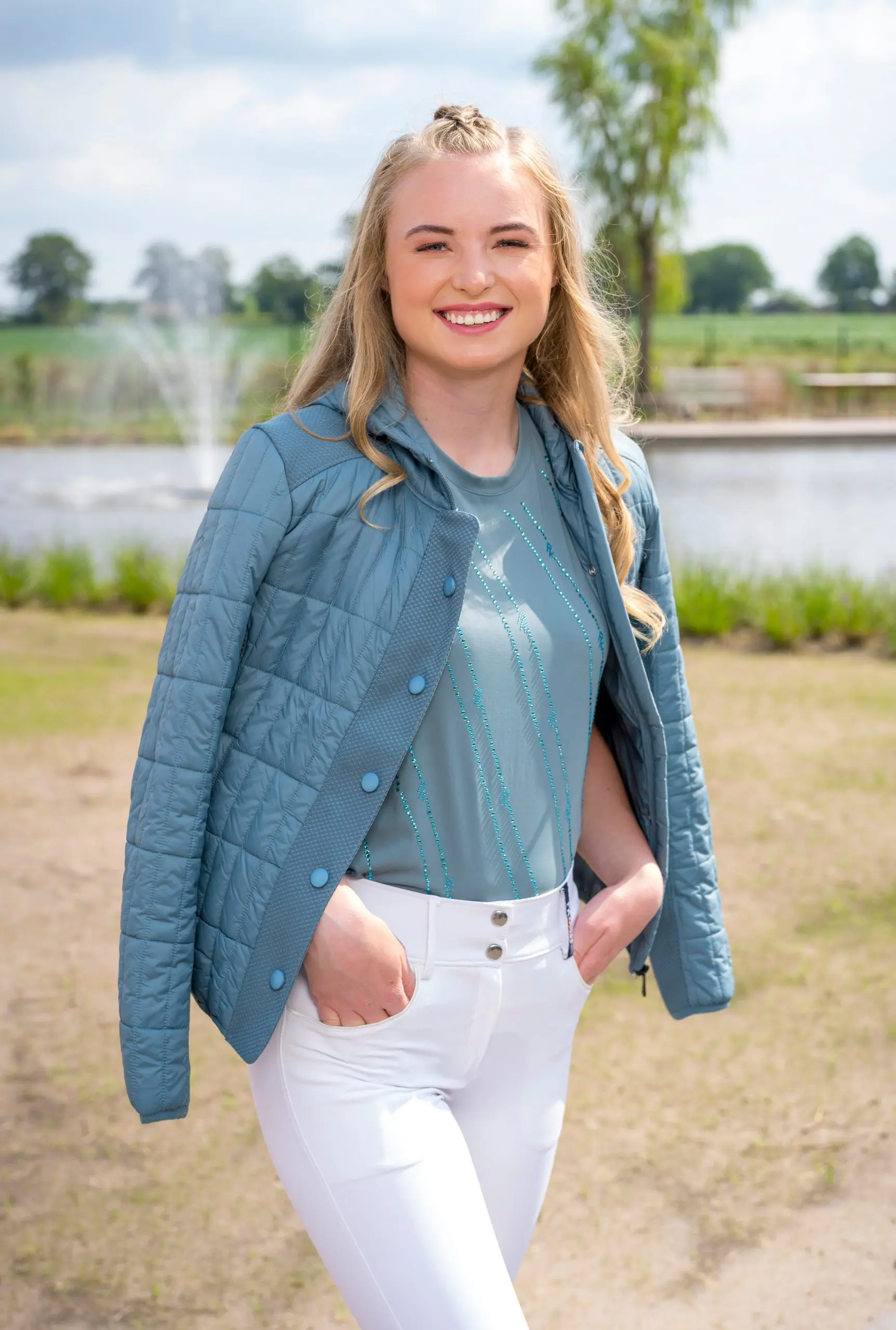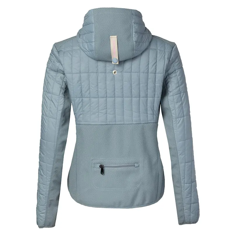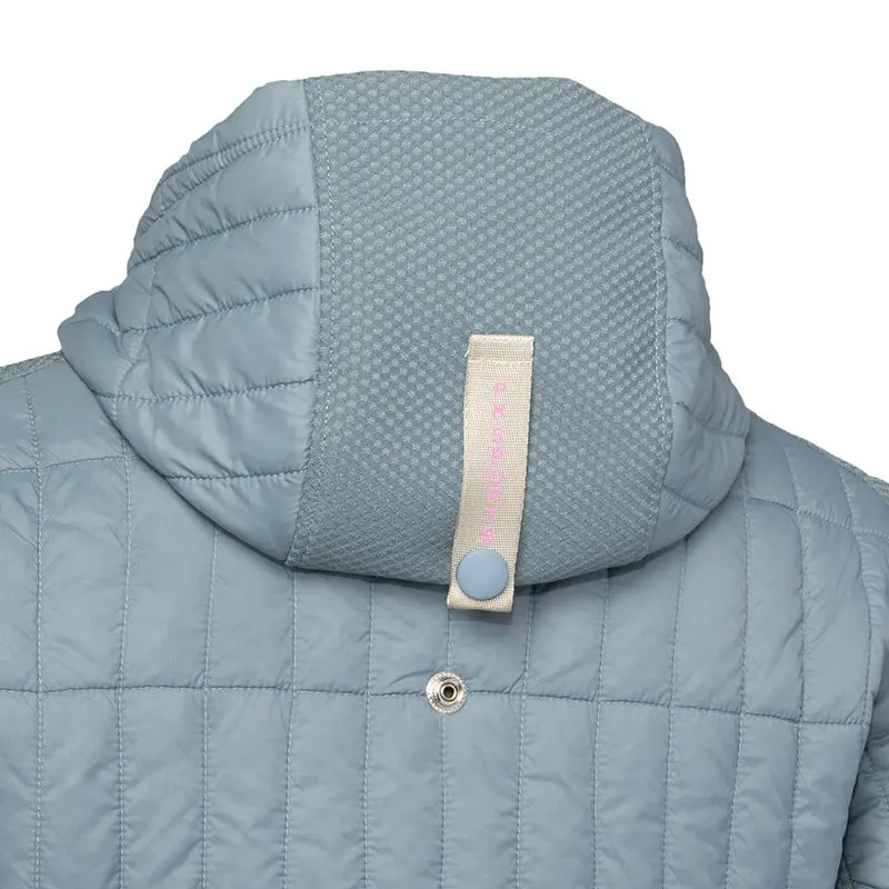 Technische lichtgewicht jas, gemaakt met twee verschillende stoffen; een glimmende nylon en ademende mesh stof. Uitgewerkt met capuchon, button om de capuchon vast te zetten, zakken met rits op de voorkant en een klein zakje op de achterkant. De jas is afgewerkt met PK details.