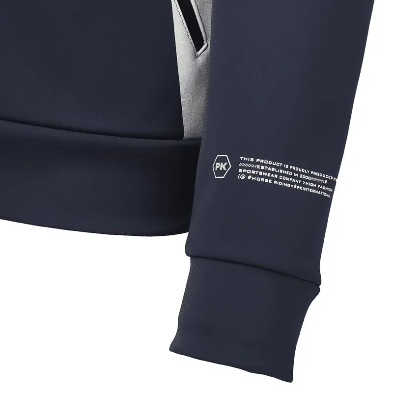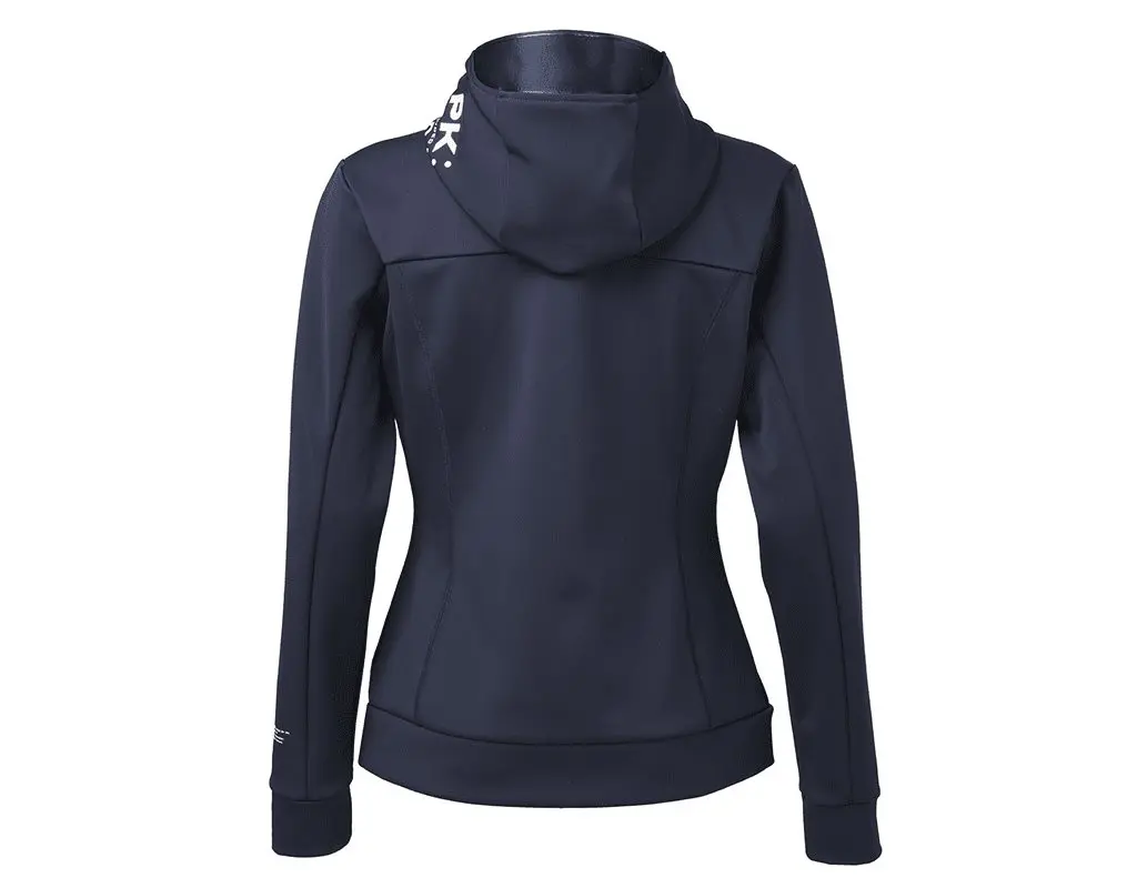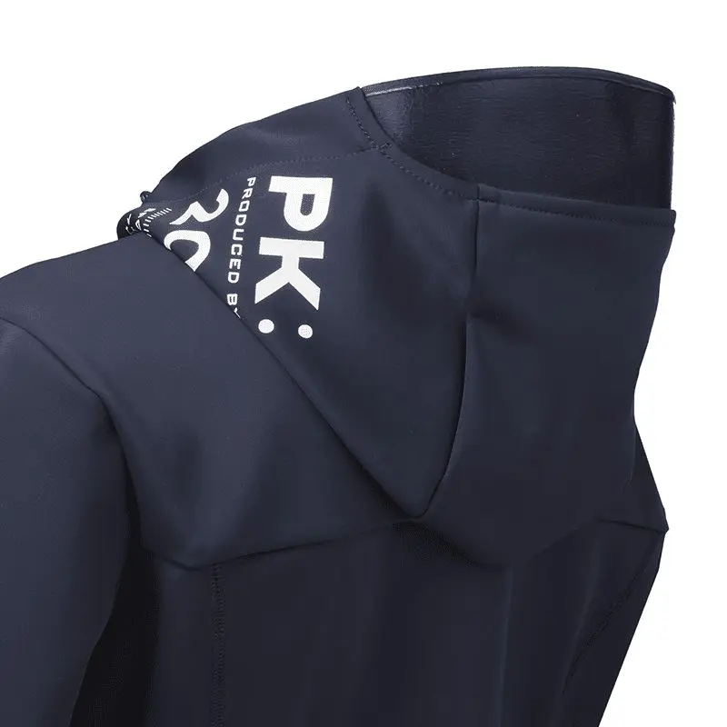 Sportieve softshell, voorzien van capuchon met frisse print, welke vastgezet kan worden met een press button. Aan de voorzijde heeft dit jack 2 rits zakken en flitsende witte strepen.