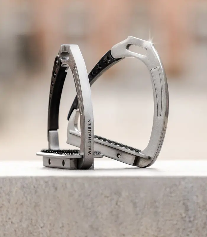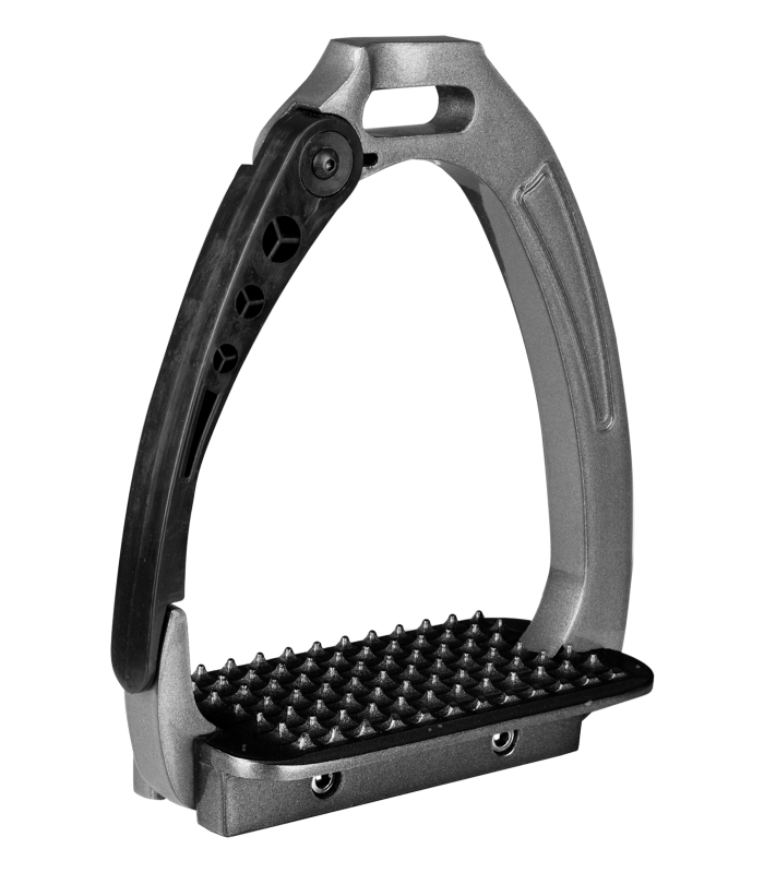 Stirrups in high quality aluminium with a 6.5 cm broad tread surface. With a hinge on the outer edge. In the event of a fall, the hinge opens due to the rider”s weight and prevents being caught up in the stirrup