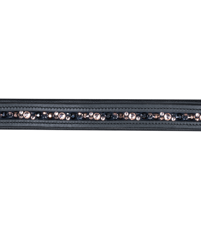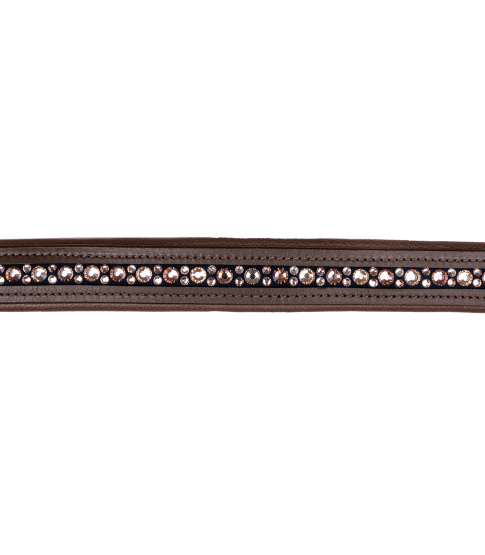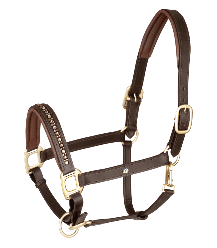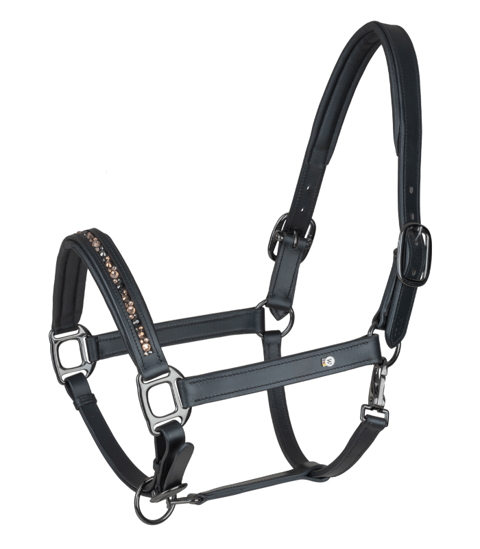 Elegant leather halter with softly padded noseband and headpiece. With decorative rhinestones on the noseband. Headpiece adjustable on both sides and easily adjustable chin strap.