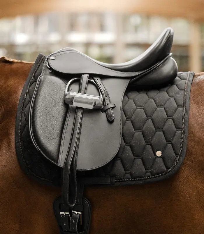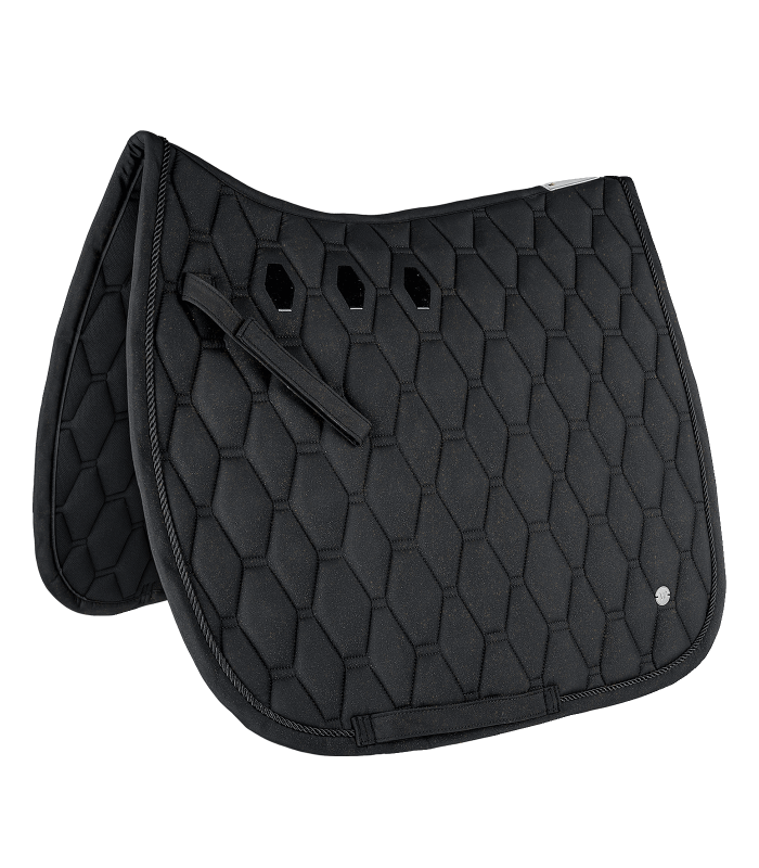 Quality saddle pad with glossy metallic outer material. There are three silicone appliquรฉs in the saddle area to ensure that the saddle cannot slip. There is an option of a simple or subdivided girth loops. The silvery metal logo and matching cord are also eye-catching features. With removable touch tape loops.